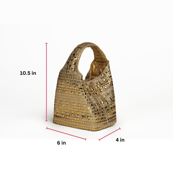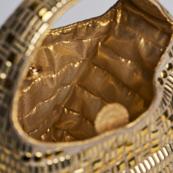 Inner Lining: The inside of the bag is finished with quilted gold lurex fabric. The inside is a single compartment for all your essentials.