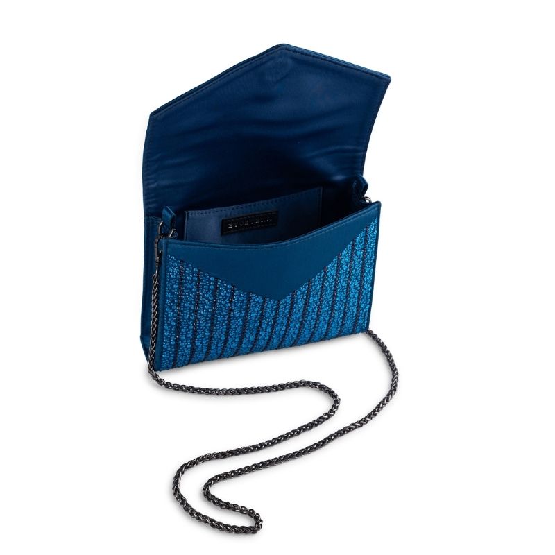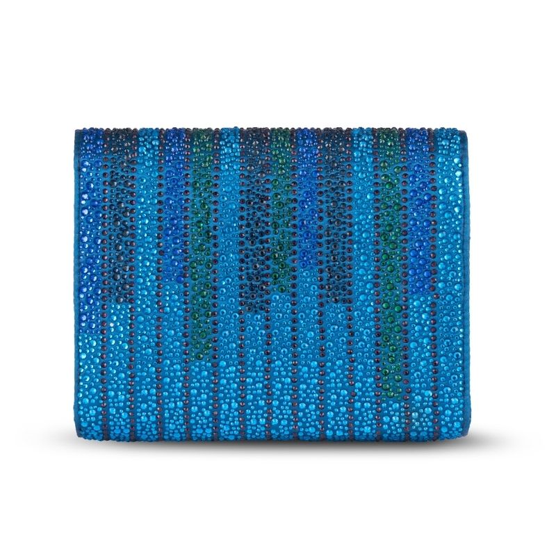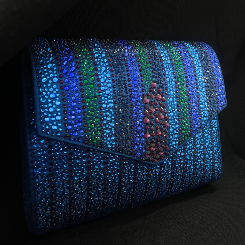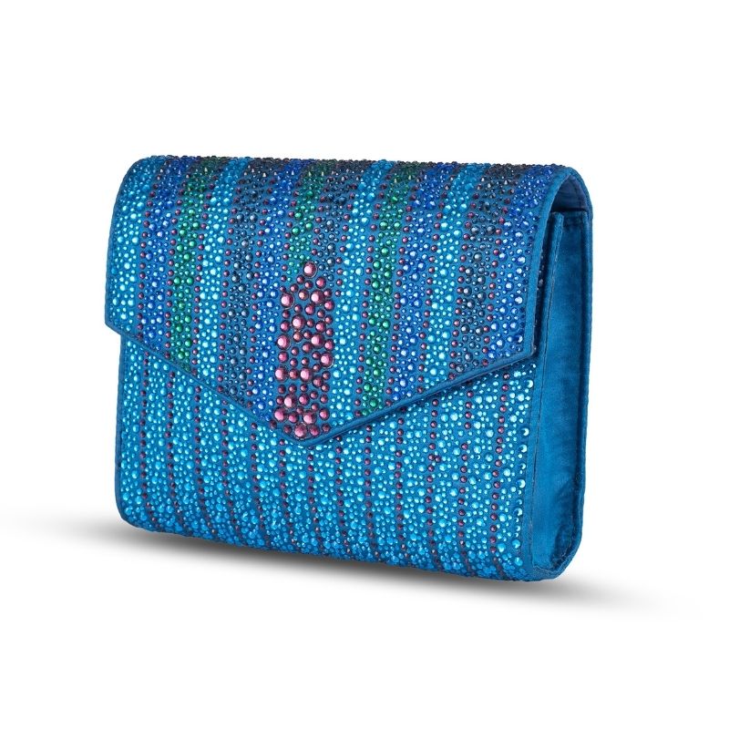 A party clutch in envelope shape with multi size crystals fixed all over. A great accompaniment for all your parties. The body is in capri blue crystals with the flap in multi coloured stripe bands where each colour compliments the others. The bag comes with a magnetic closure and a gun metal chain for shoulder carry. The size can perfectly fit in your party essentials including your phone.