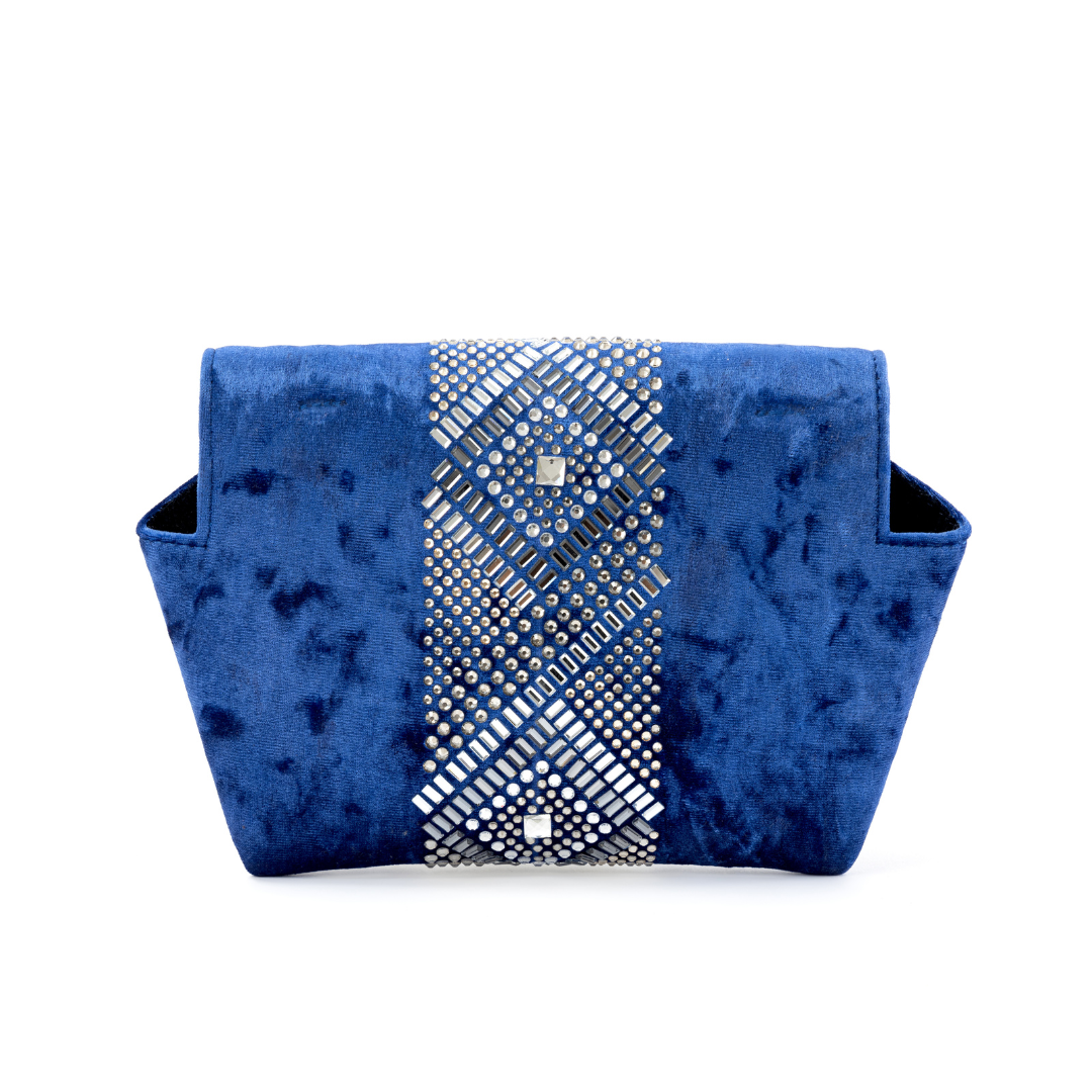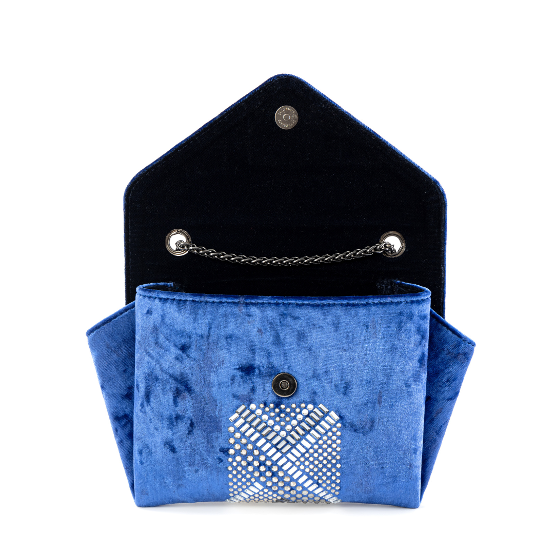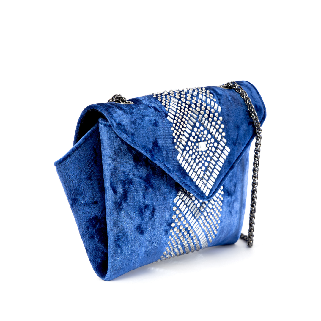 A modern classic in soft velvet, this bag is elevated with intricate crystal embellishments in geometric patterns across the flap and body. Designed with a magnetic flap closure for secure storage, it blends elegance with function. The bag features a chain sling threaded through eyelets on top, allowing for versatile styling — carry it as a chic shoulder bag or crossbody for hands-free ease. Perfect for festive occasions, evenings out, or when you want to add a statement sparkle to your look.
