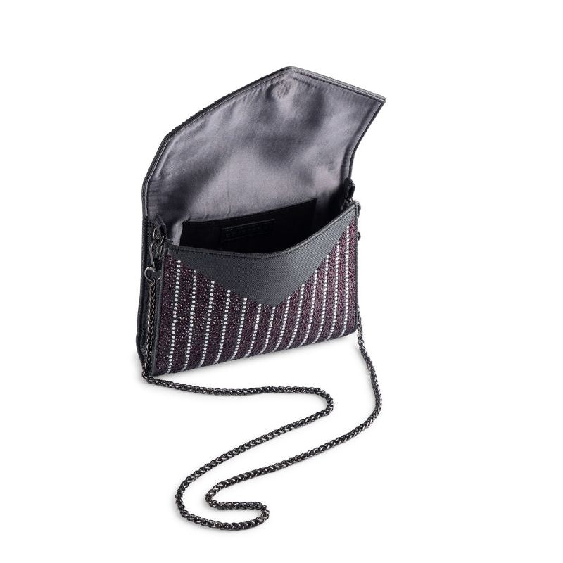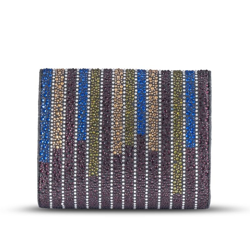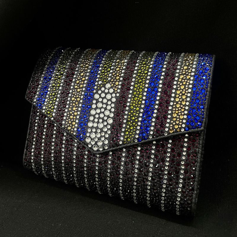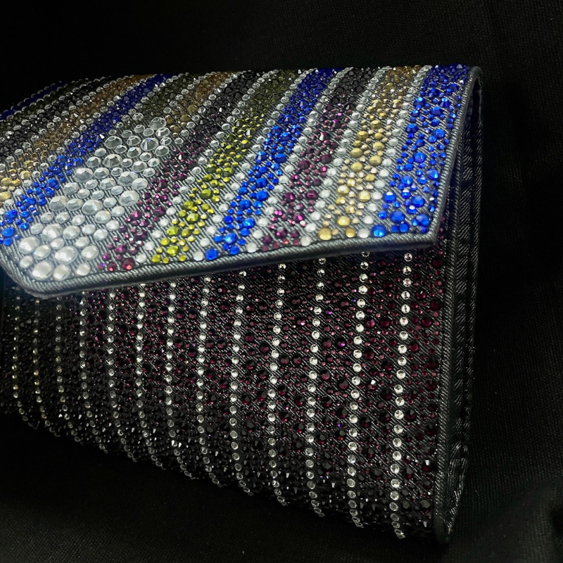 A party clutch in envelope shape with multi size crystals fixed all over. The body is in Amethyst colour crystals with the flap in multi coloured stripe bands complimenting each other.The bag comes with a magnetic closure and a gun metal chain for shoulder carry. The size can perfectly fit in your party essentials including your phone.