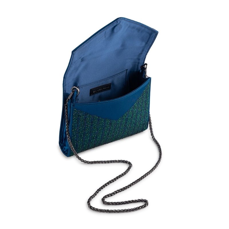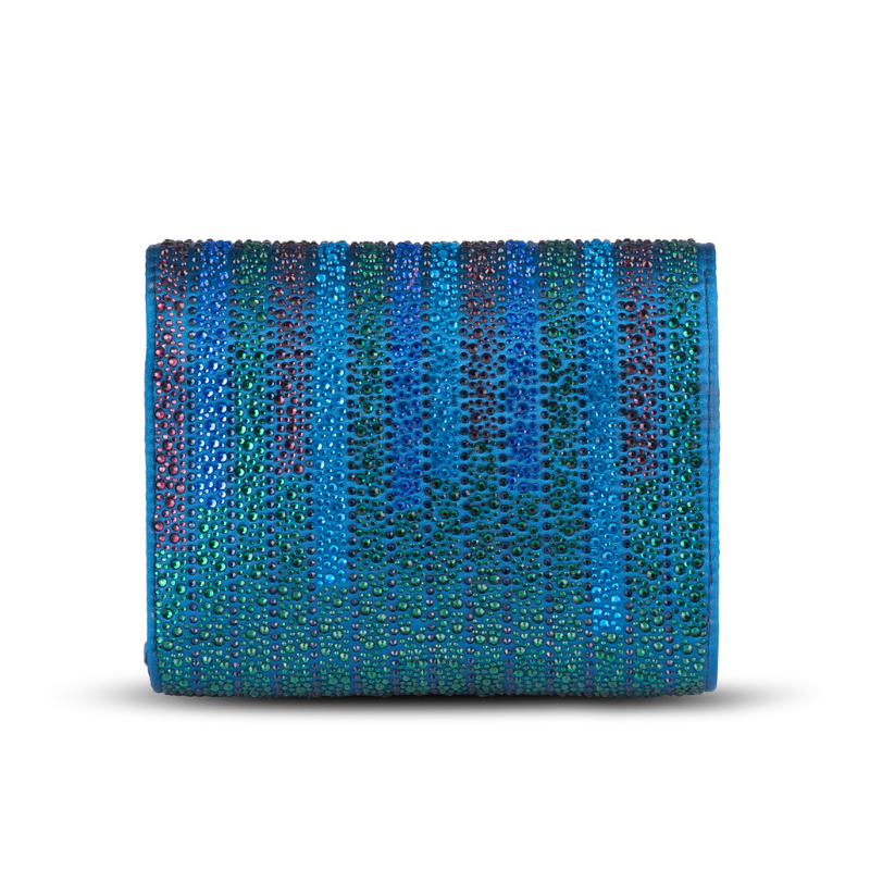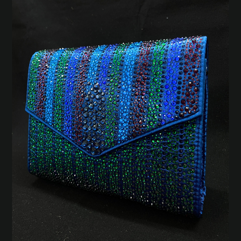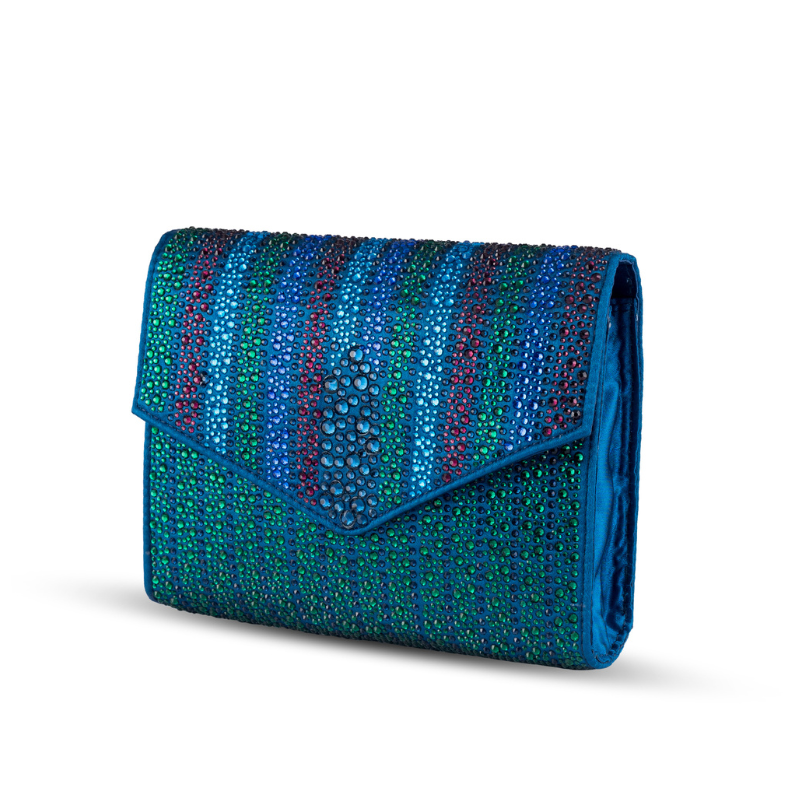 A party clutch in envelope shape with multi size crystals embellished all over the outer body of the clutch. The main front and back body is in emerald green colour crystals with the flap in multi coloured stripe bands complimenting each other.The bag comes with a magnetic closure and a gun metal chain for shoulder carry. The size can perfectly fit in your party essentials including your phone. A striking accessory for your wedding and festival parties.