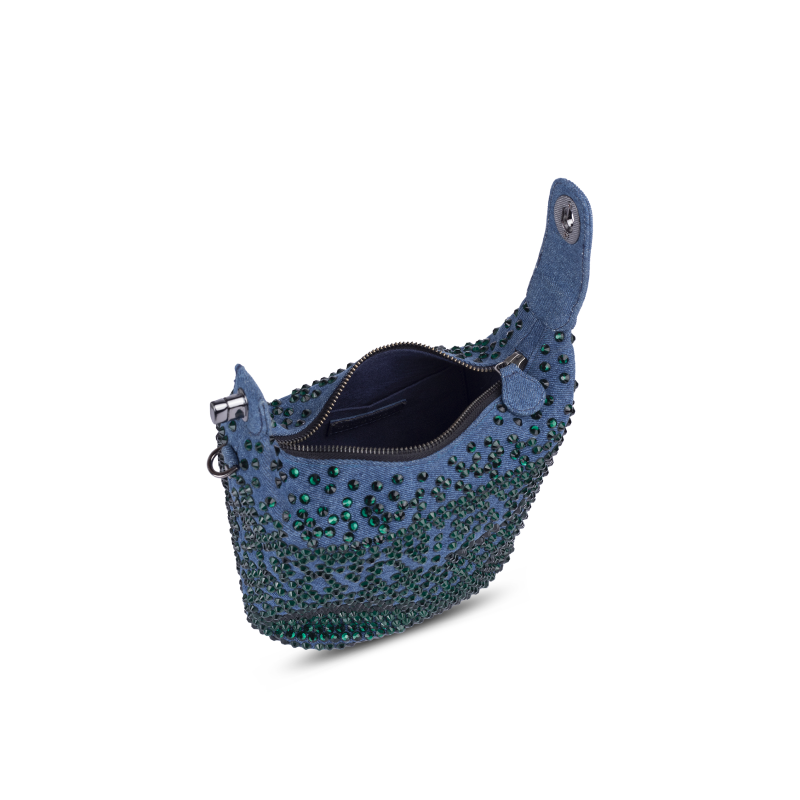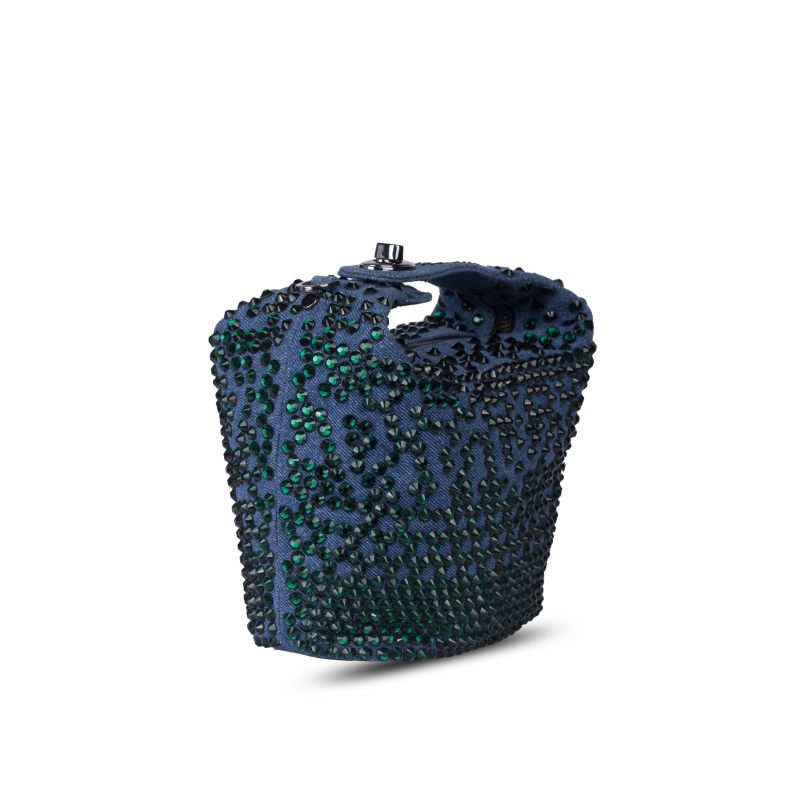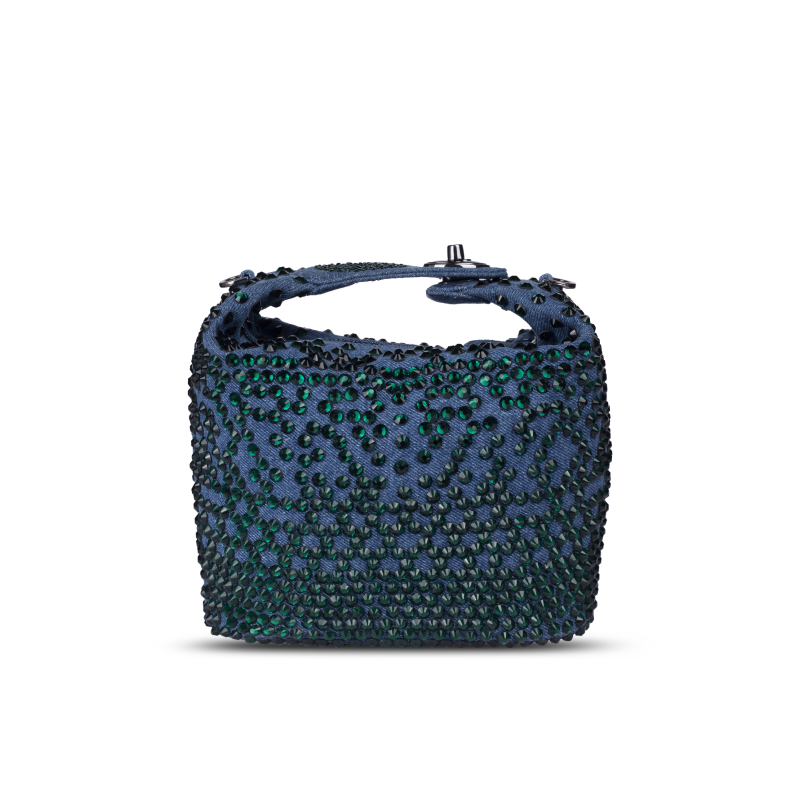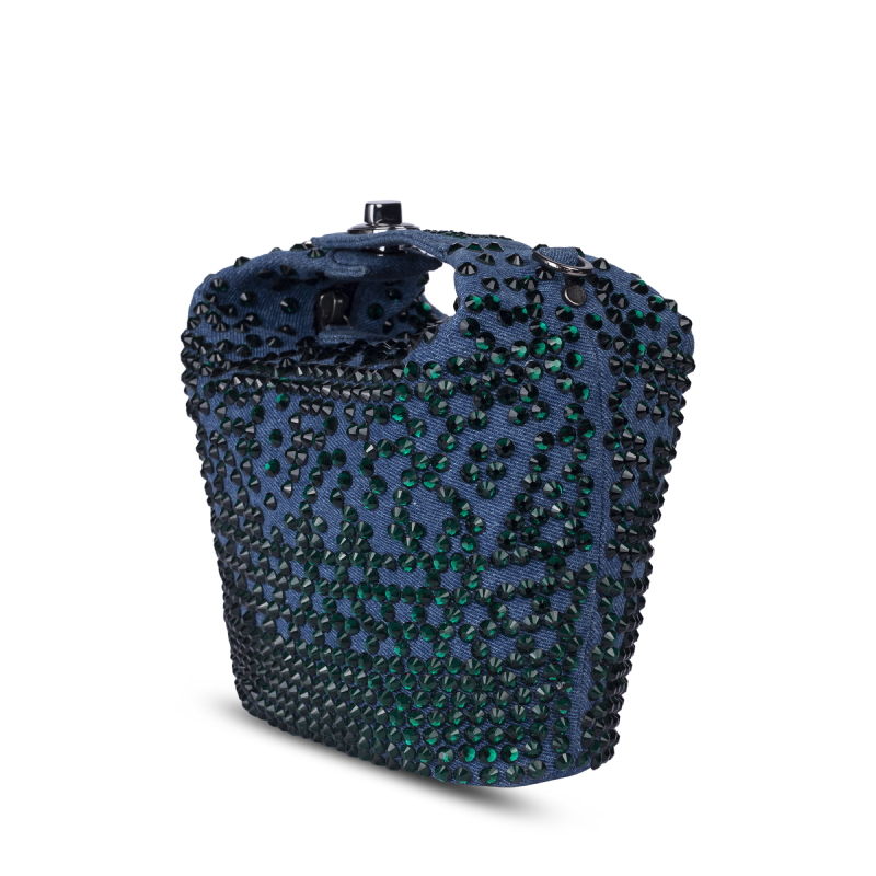 A pouch shaped party bag for women in washed denim with emerald green crystal embellishments all over the body. The bag is fitted with a zipper closure. The top handle in denim is also embellished with emerald crystals. The top handle comes with a lock that opens out the denim flap for easy accessibility inside the bag. A detachable metal chain is provided for shoulder carry. The bag adds a subtle sparkle to your ensemble. The size is perfect to carry all your essentials for a formal evening party.