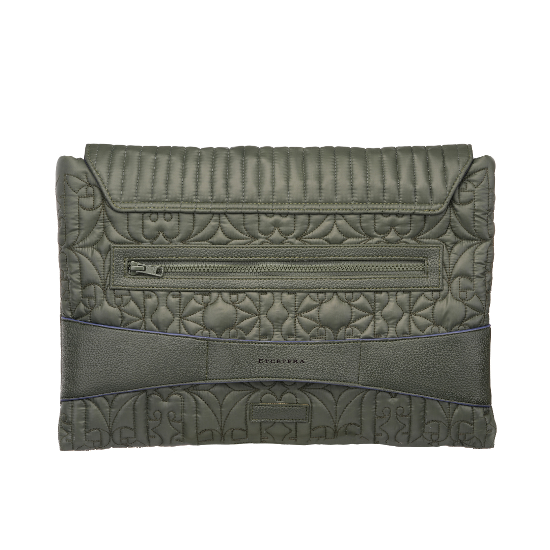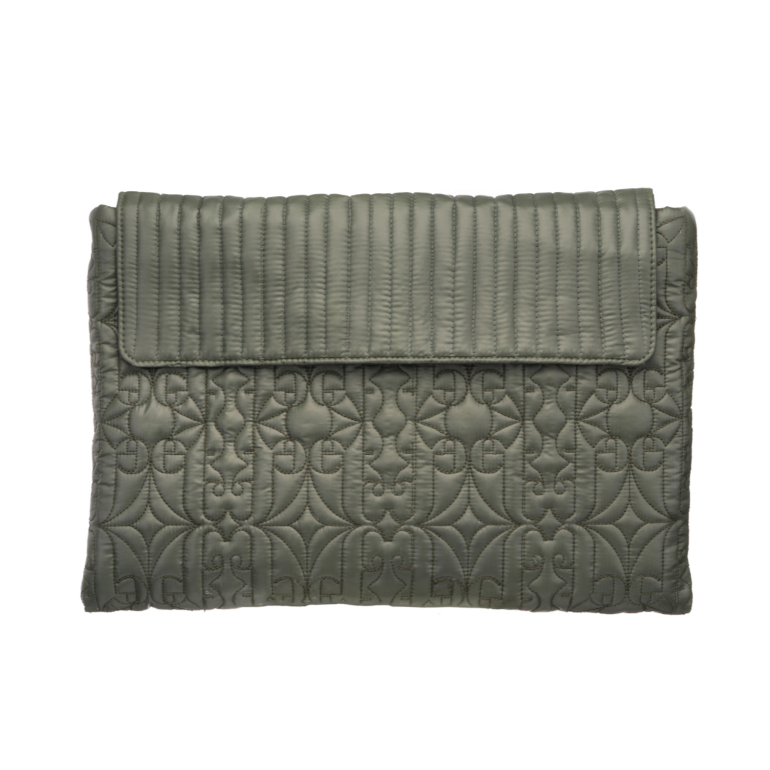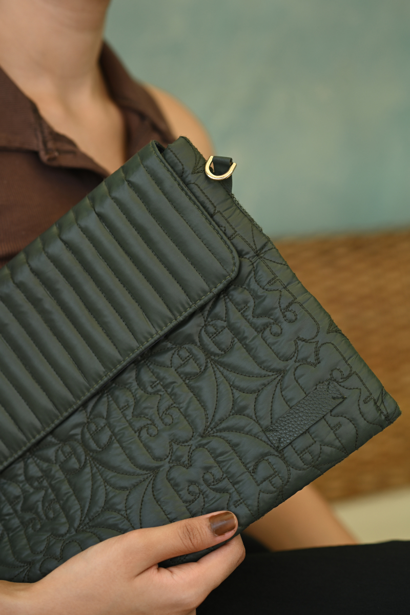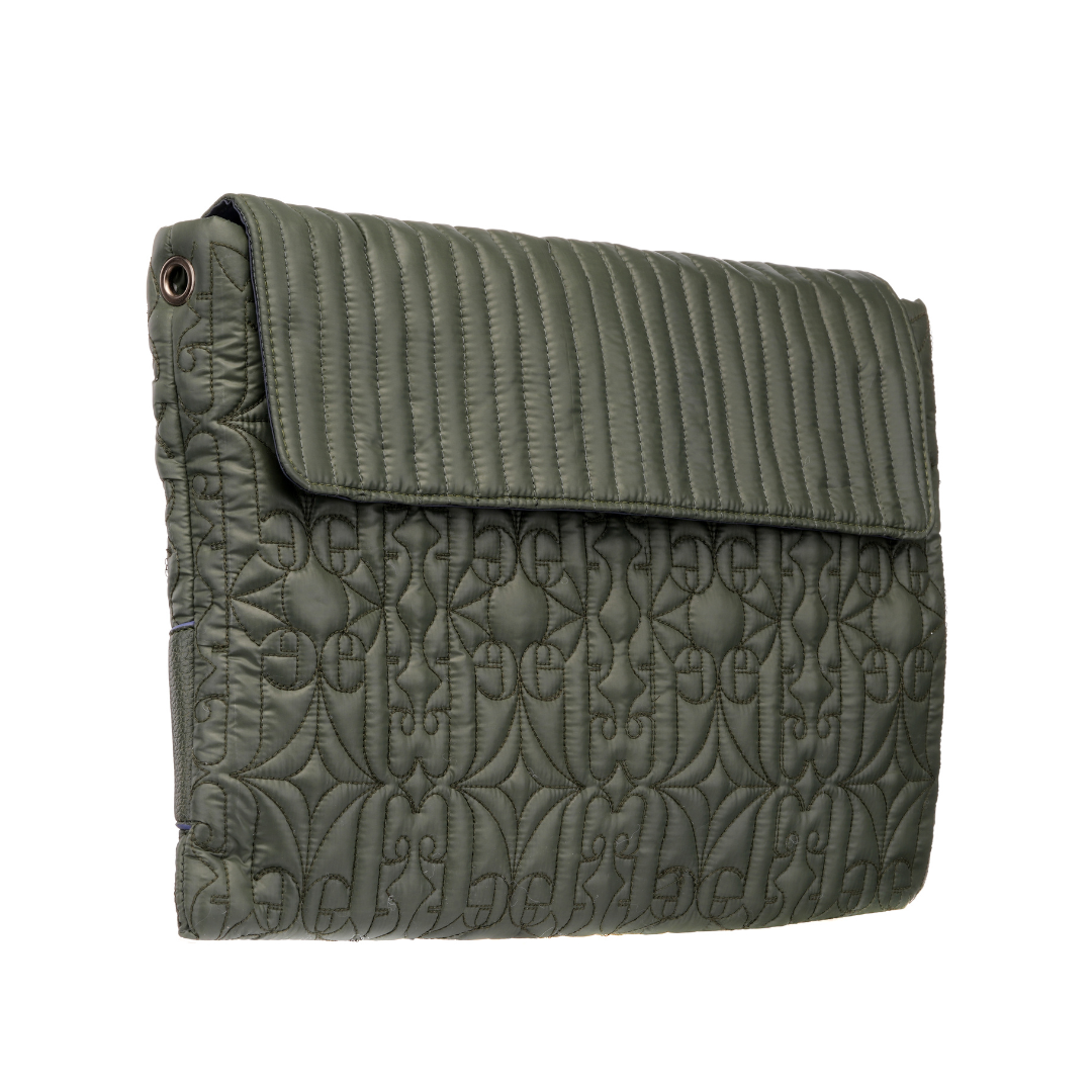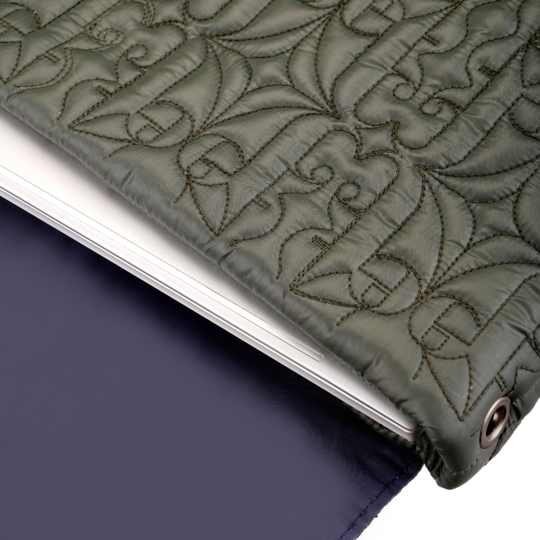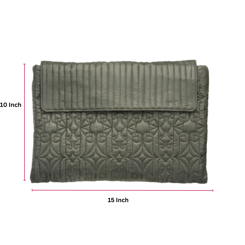 This handcrafted, 100% PETA-approved quilted laptop sleeve is designed to blend elegance with everyday utility. Made from water-repellent fabric, it features a custom logo quilt pattern that adds both texture and a touch of signature branding, while providing gentle protection against daily impacts.The flap is detailed with linear quilting and secured with a magnetic closure for ease and style. On the back, a zippered pocket offers convenient storage for your mobile phone, notepad, wallet, and other small essentials. For added comfort, a vegan leather band is placed at the back, offering hand support while carrying. Additionally for versatile use, metal fittings on the sides allow you to attach a sling handle and convert it into a shoulder carry.