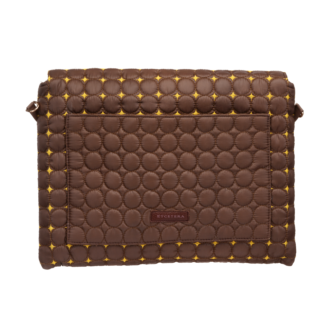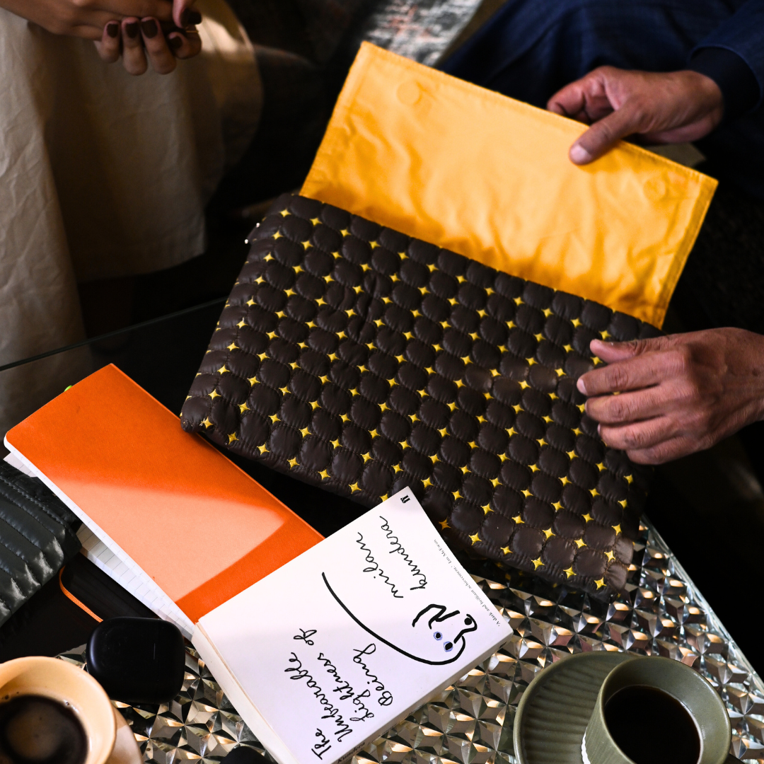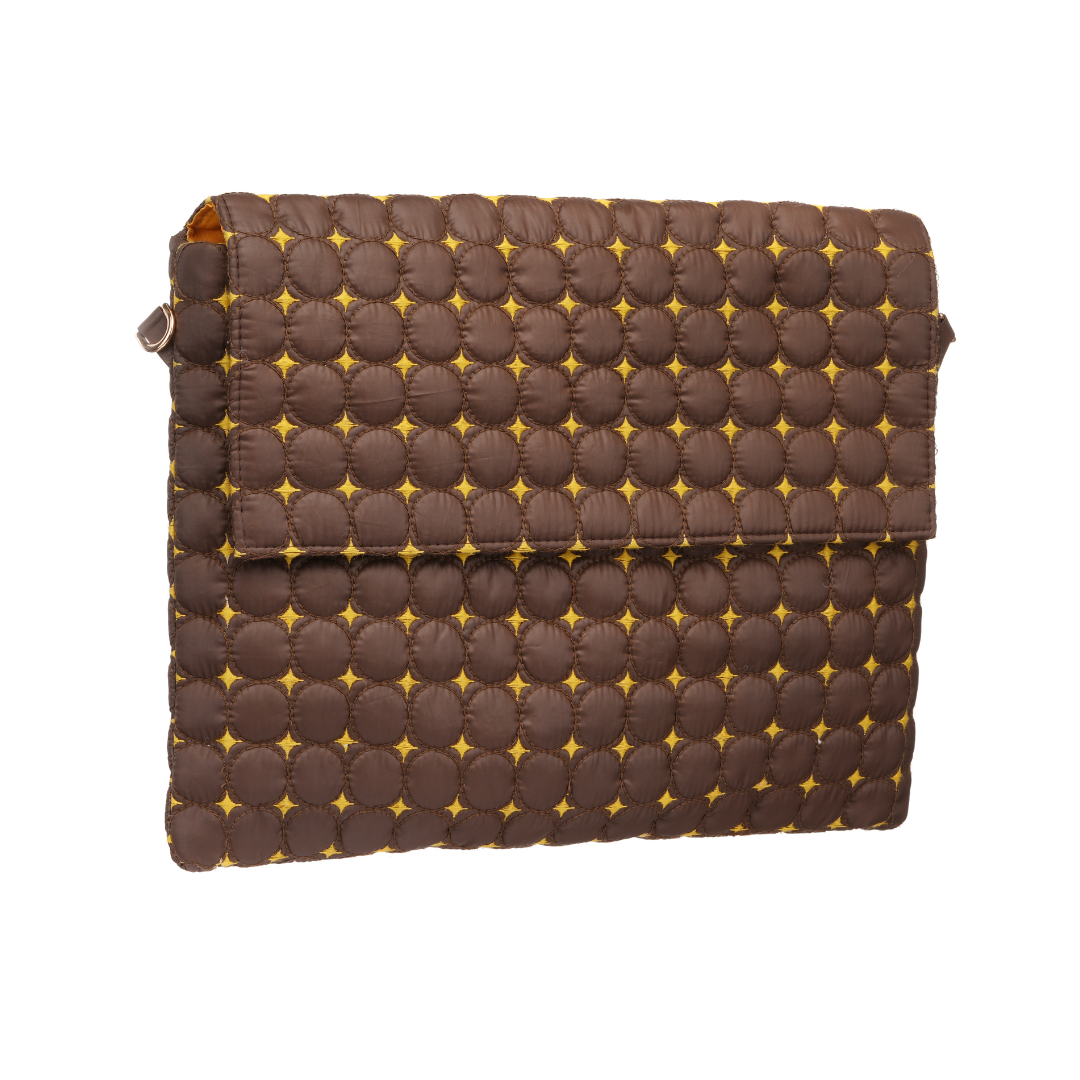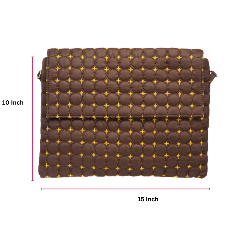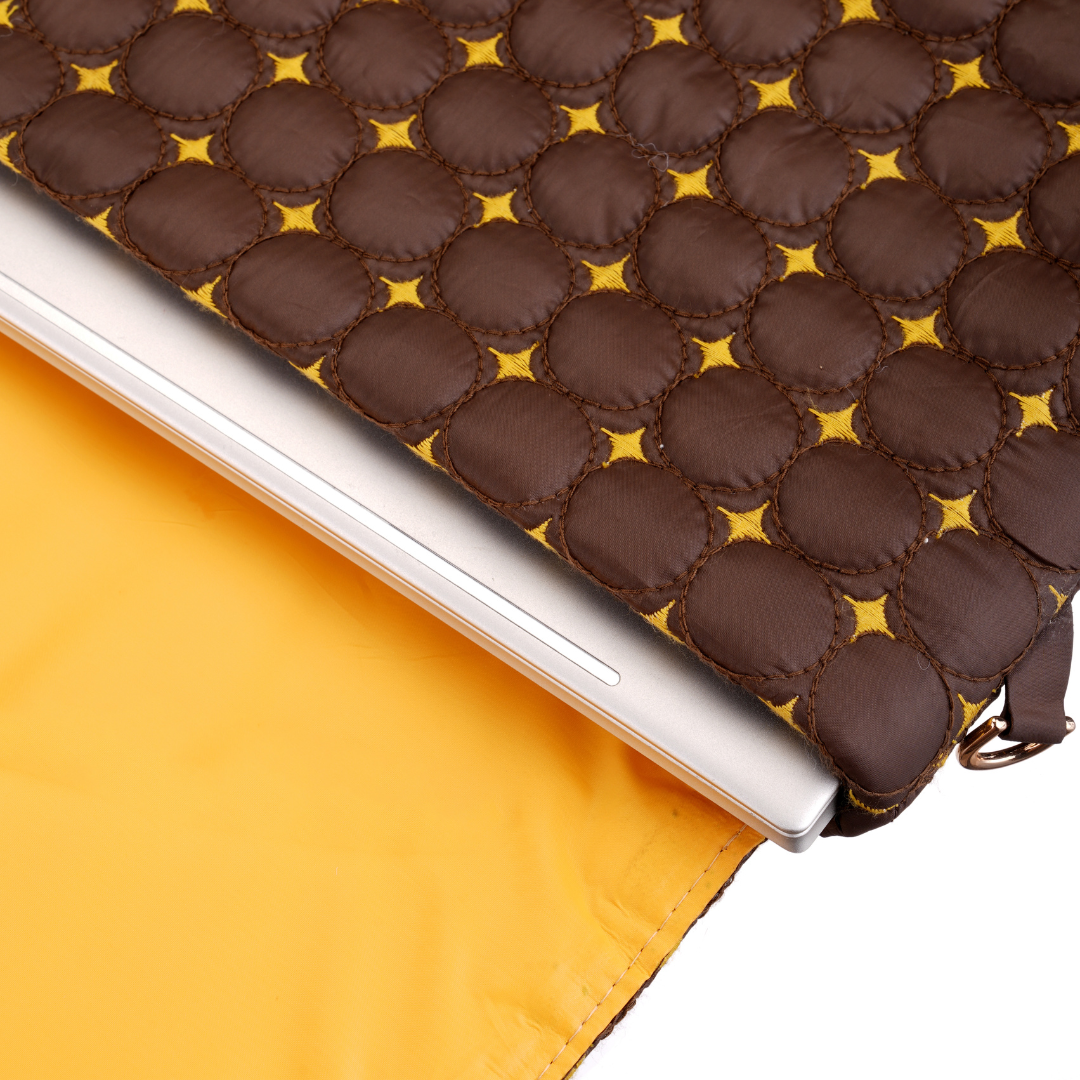 A handcrafted, 100% PETA-approved laptop sleeve designed for the young and on-the-move. Made from quilted, water-repellent fabric both inside and out, it offers durable protection while keeping things light and stylish.The sleeve features a unique circular quilting pattern, enhanced with contrast-colored embroidered stars delicately placed between the circlesÑadding a playful yet refined touch. A spacious back pocket offers room for your notebook, mobile phone, wallet, or other everyday essentials. The magnetic flap closure keeps your laptop secure and easily accessible. Finished with elegant gold-tone metal fittings on the sides, the sleeve allows you to attach a sling handle for comfortable shoulder carry.