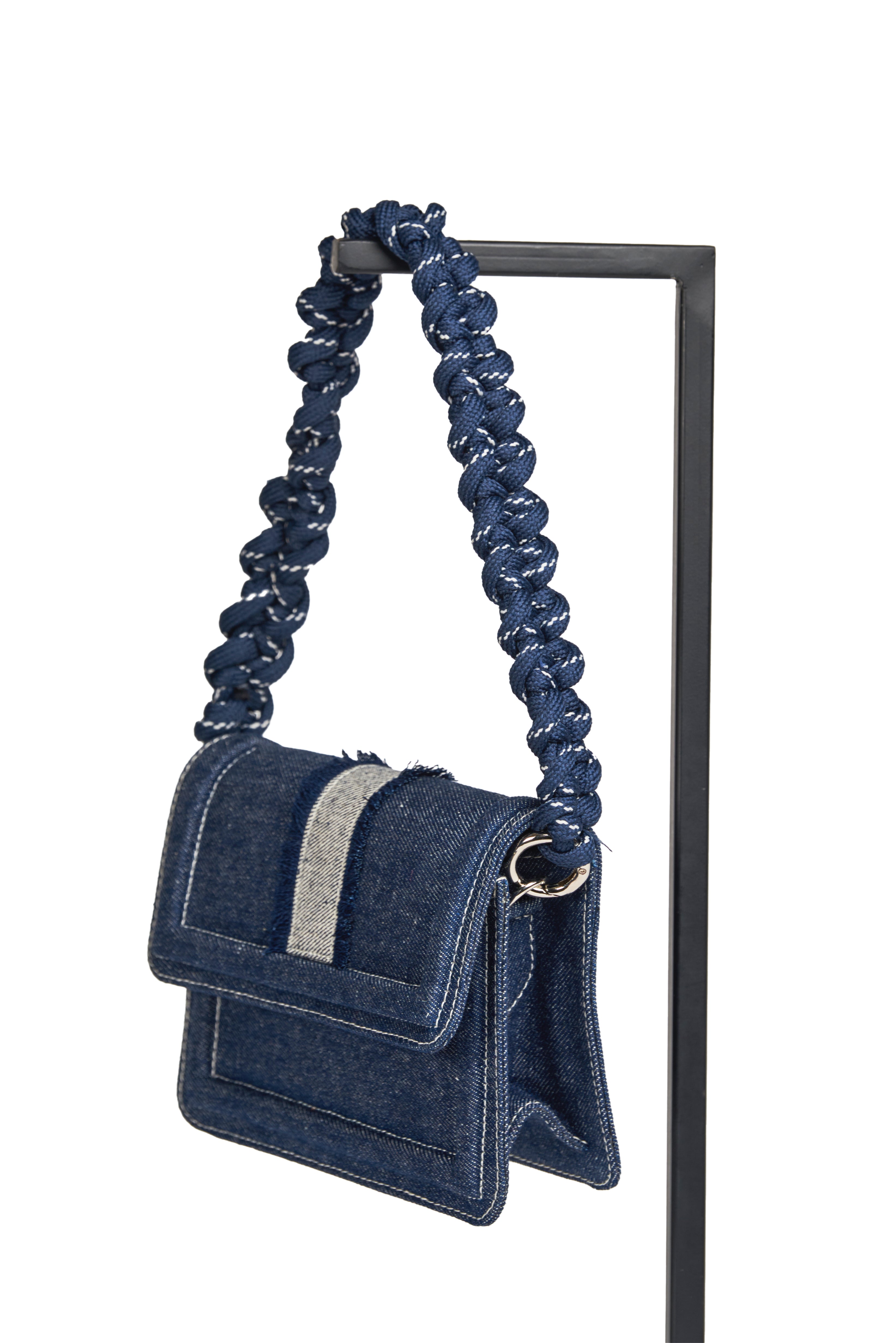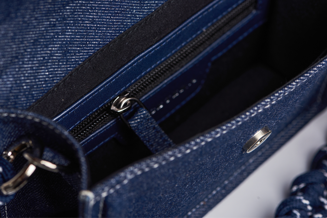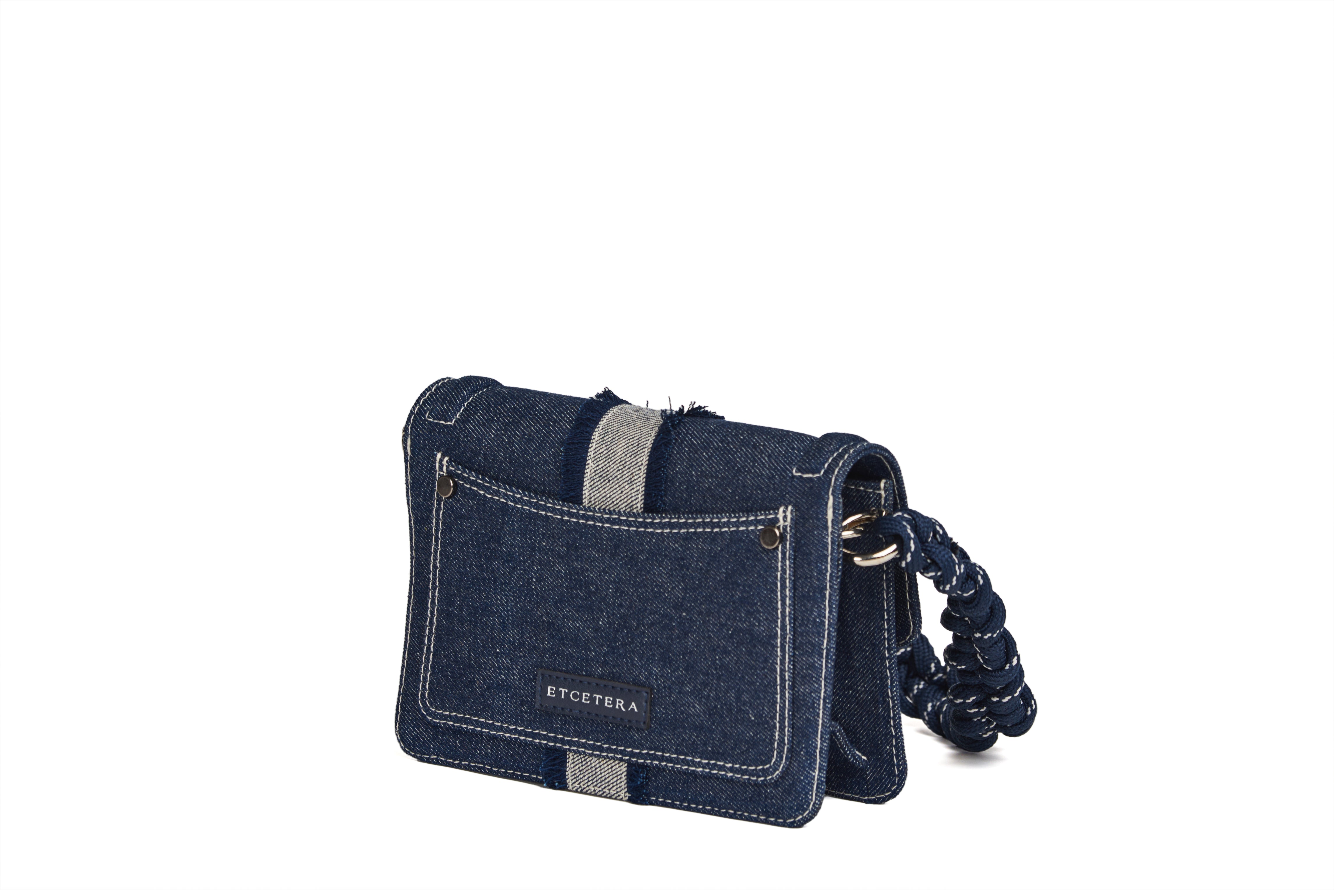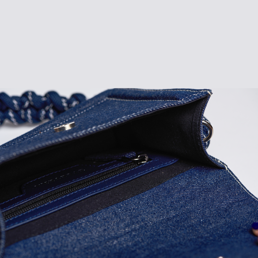 A mini bag for women who like to keep it light and casual. The trendy mini handbag is made in dark blue denim fabric with a detachable cotton cord handle. The size of the bag allows you to carry your mobile phone and other essentials such as keys, cards and cash. The inside of the bag is a single compartment. The back of the bag also has a small open open pocket for your convenience. This mini also has two other variants to choose from.
