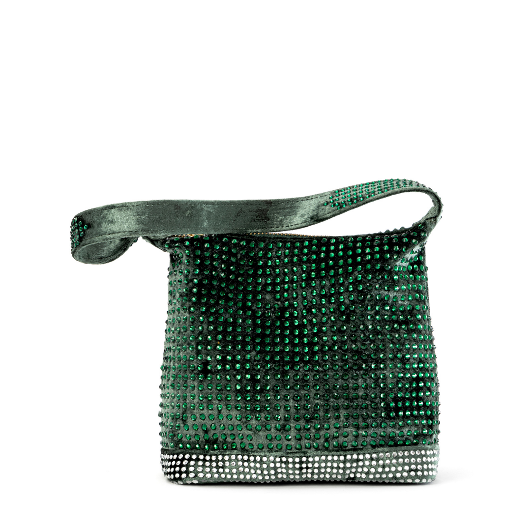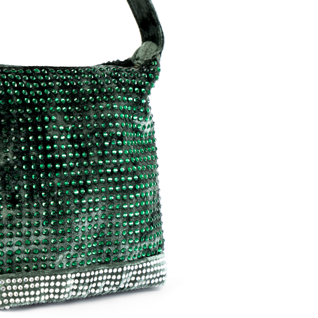 A crystal-embellished party handbag crafted in soft velvet, designed to add dazzle and elegance to your look. The body is fully adorned with crystals matching the base fabric colour for a refined shimmer, a silver crystals band adds an extra shimmer to the party bag. A secure zipper closure keeps your essentials safe. Compact and versatile, the size and style is perfect for festive occasions and evenings out. The size is perfect for carrying all your party essentials.