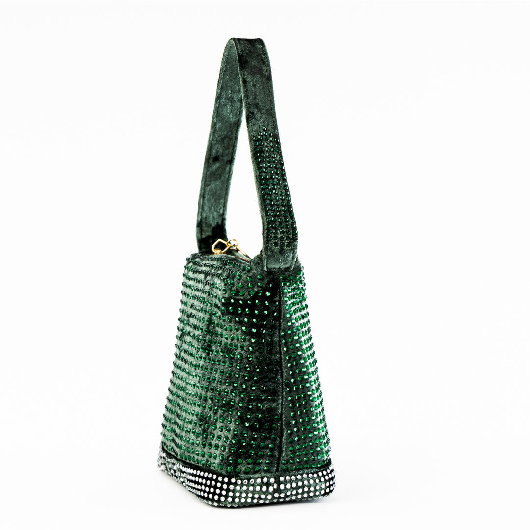 Handle: The bag features a velvet handle with matching crystal embellishment along the sides and is a comfortable hand carry.
