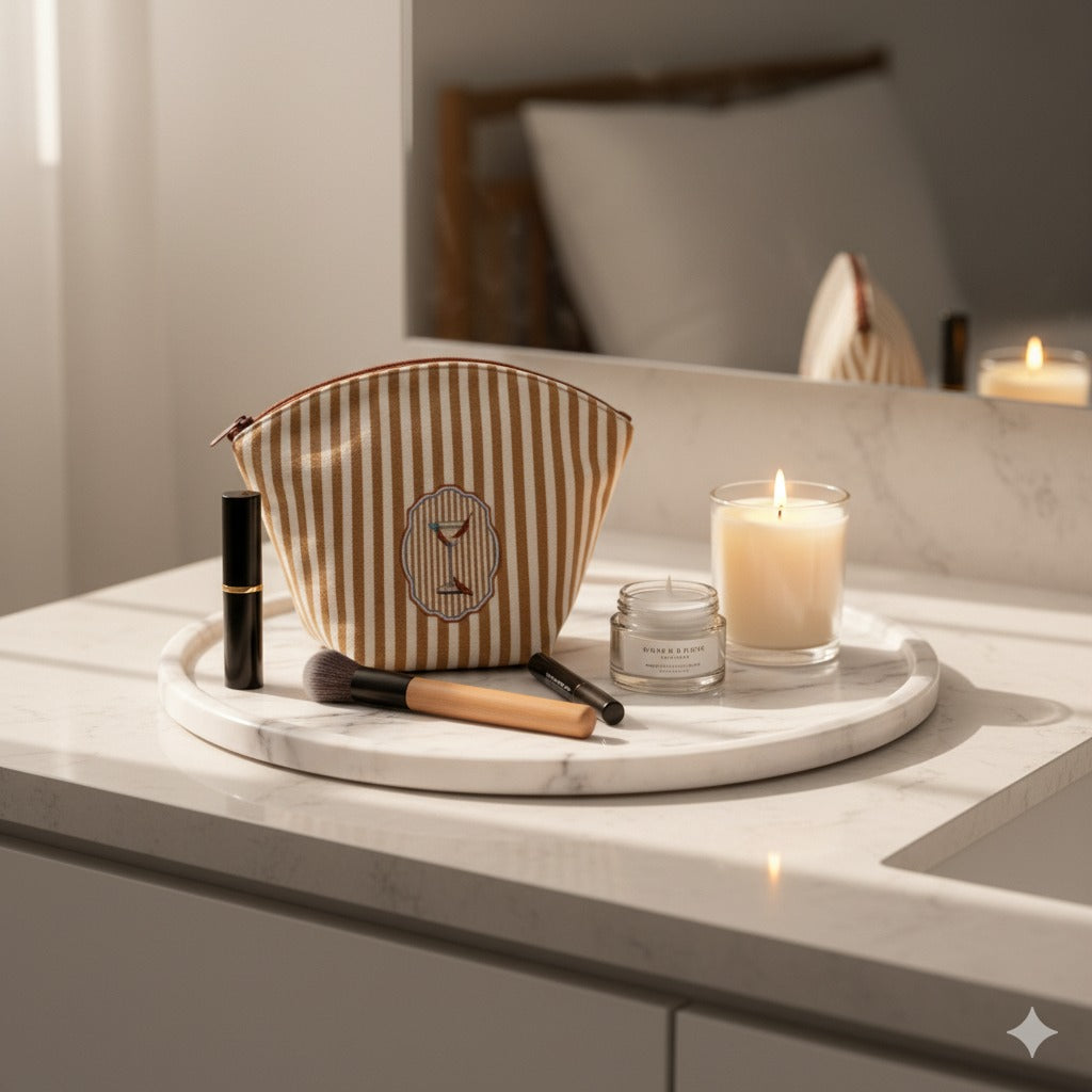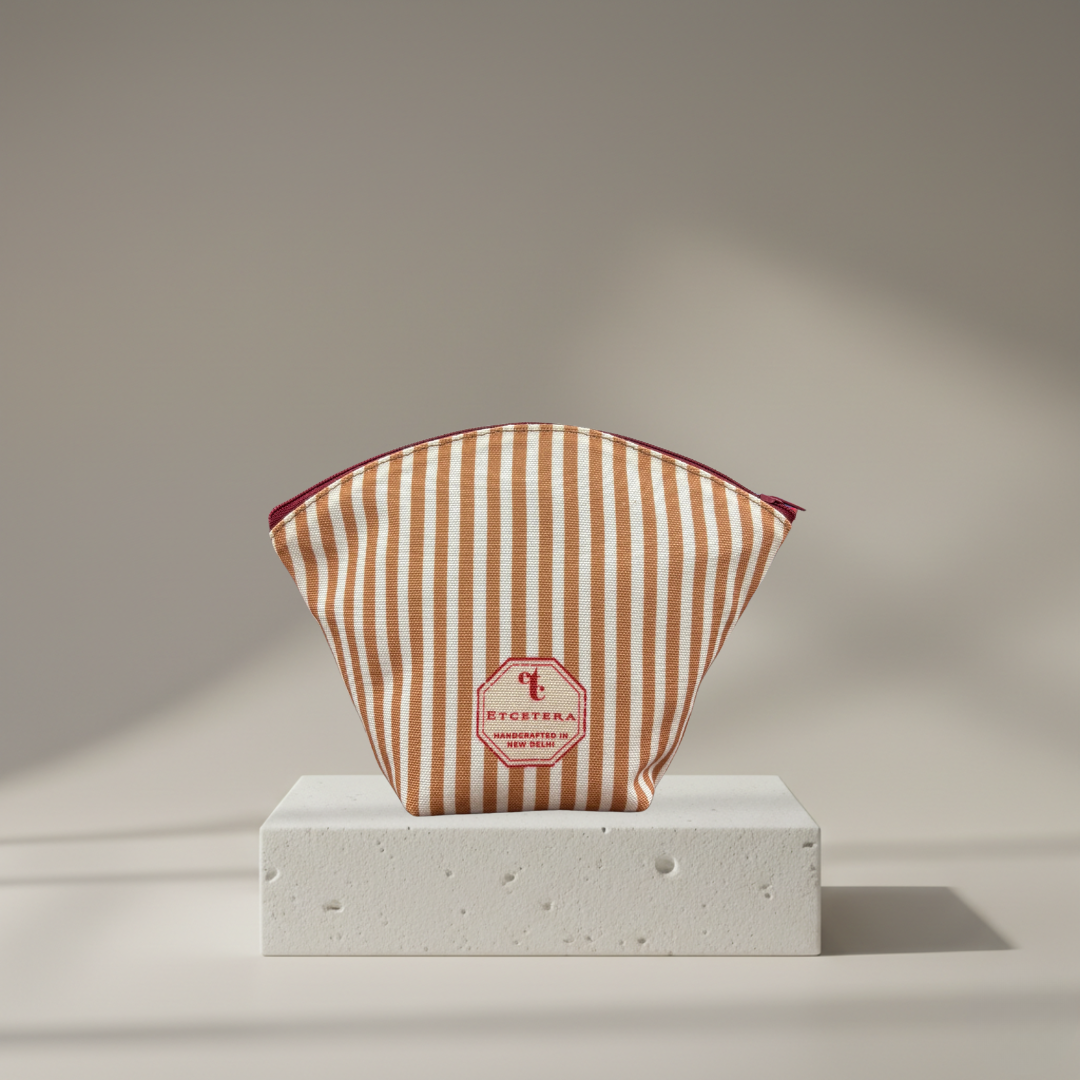 It’s always 5 PM somewhere, especially in your bag. The Stripe Right Vanity Pouch – Cocktail Hour serves up warm sand-and-cream stripes with a tiny martini glass motif that brings just the right amount of cheeky chic. Crafted from digitally printed canvas, this fan-shaped favourite opens wide and holds everything from glam-on-the-go makeup to cables, minis, and “just in case” essentials. It’s sturdy, roomy, and stands upright like it’s ready to raise a toast.