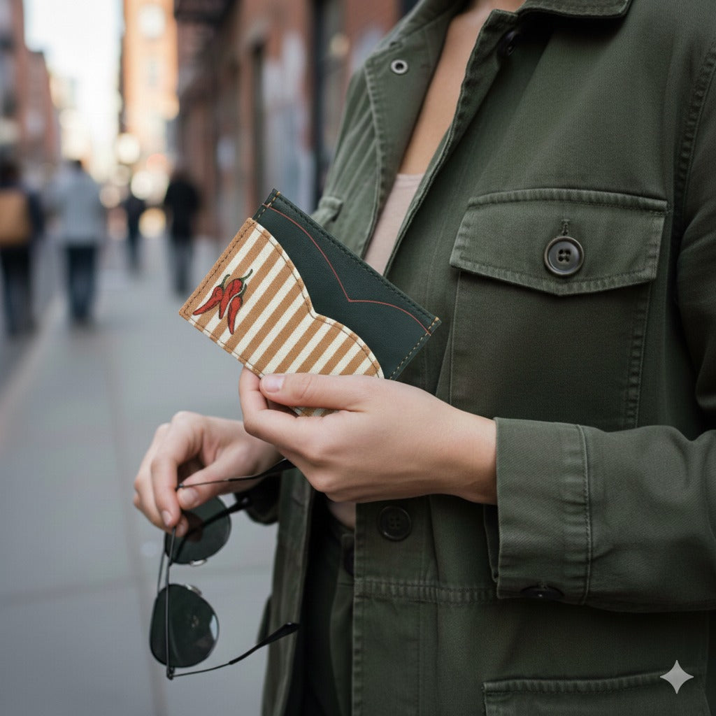 Turn up the heat with the Stripe Right – Hot Chillies Wallet. Bold, spicy, and impossible to ignore! With warm tan stripes, fiery red pockets, and a trio of chillies that bring the drama, this one’s made for the ones who like it hot. Crafted from digitally printed canvas, vegan leather, 100% PETA approved and fitted with 5 handy pockets, it keeps your essentials sorted while adding just the right amount of sass.