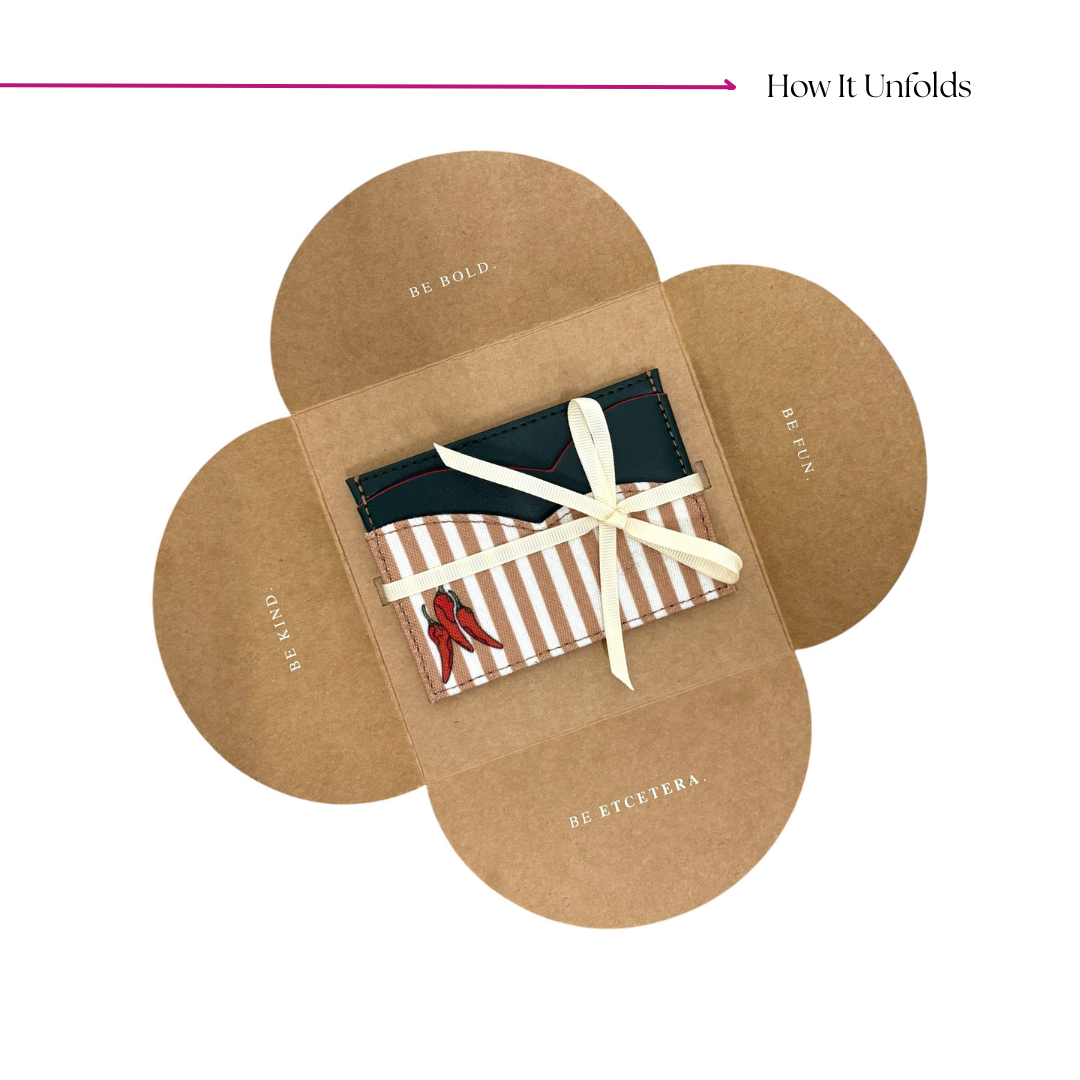 Every card wallet comes in our fold-open kraft packaging, finished with a ribbon tie and perfect for gifting.