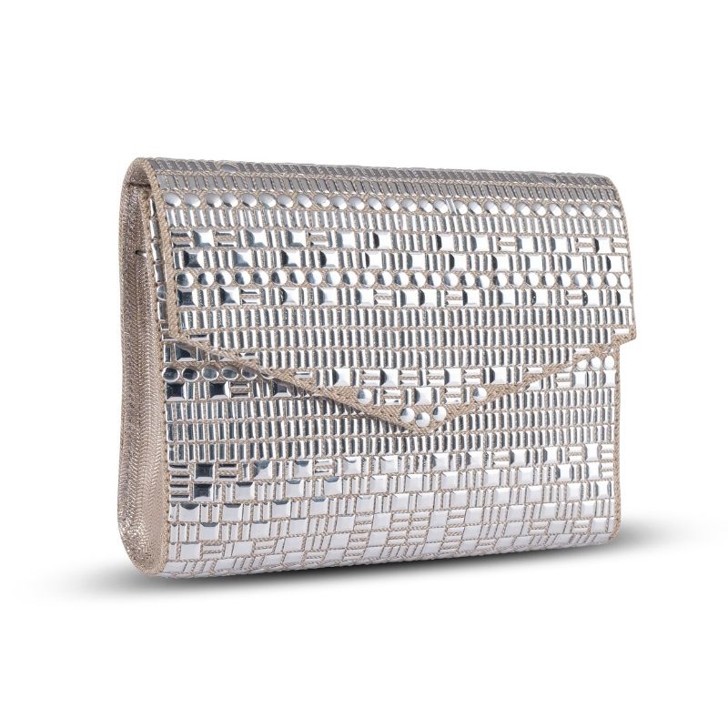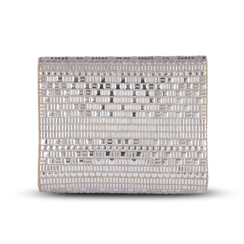 A perfect all silver luxury clutch bag for your wedding functions. An accessory to carry with all your pastels, white ensembles or contrast with your black outfits. The envelope clutch is embellished with metal silver finish pieces fixed all over on fabric. The bag comes with a magnetic closure for keeping the cover flap in place. A silver finish metal chain is attached for shoulder carry option. The size of the bag allows you to carry your phone and other party essentials in it.