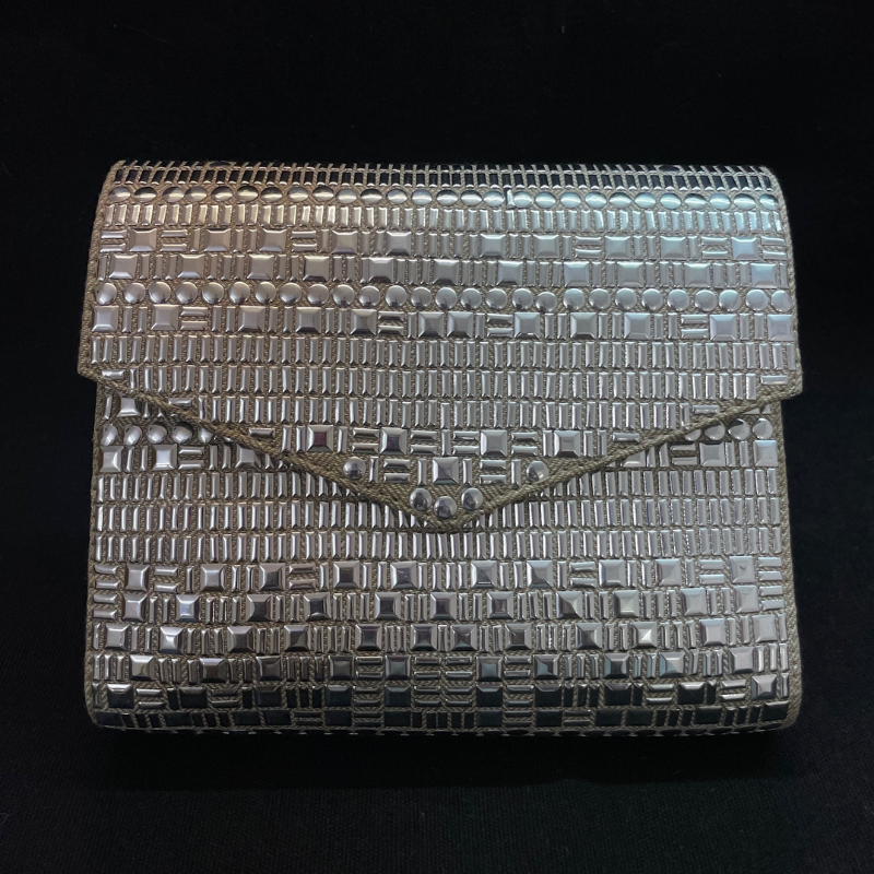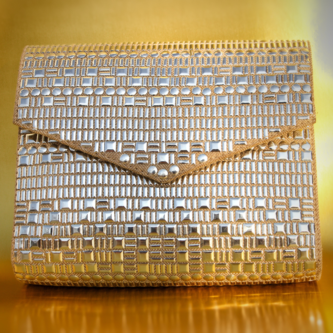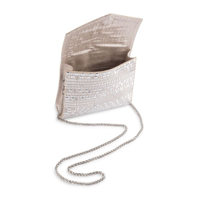 Inside of the bag: The inside of the clutch is a single compartment lined with gold silver woven fabric. A single slip pocket is provided for cards etc.