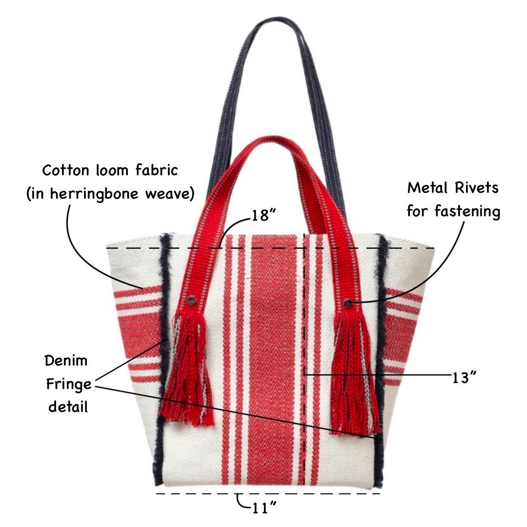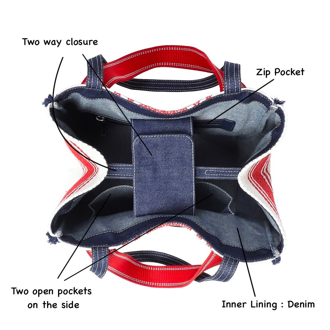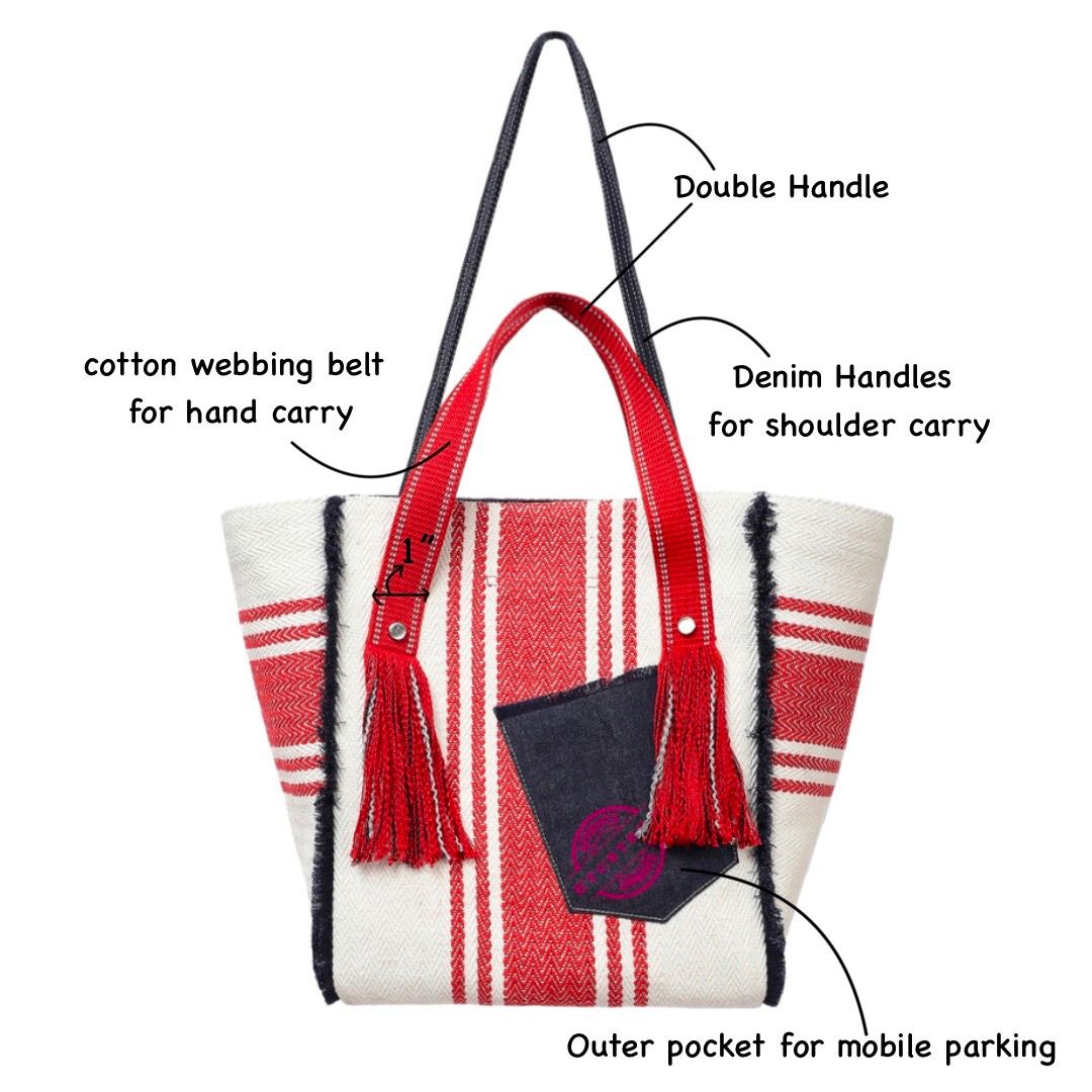 Handle:?The tote comes with 2 handles. Thick 1 inch wide red colour double handle in cotton webbing for hand carry. Two denim straps attached at the top of the bag for shoulder carry add extra convenience to this travel tote for women.