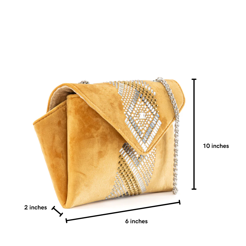A modern classic in soft velvet, this bag is elevated with intricate crystal embellishments in geometric patterns across the flap and body. Designed with a magnetic flap closure for secure storage, it blends elegance with function. The bag features a chain sling threaded through eyelets on top, allowing for versatile styling — carry it as a chic shoulder bag or crossbody for hands-free ease. Perfect for festive occasions, evenings out, or when you want to add a statement sparkle to your look.