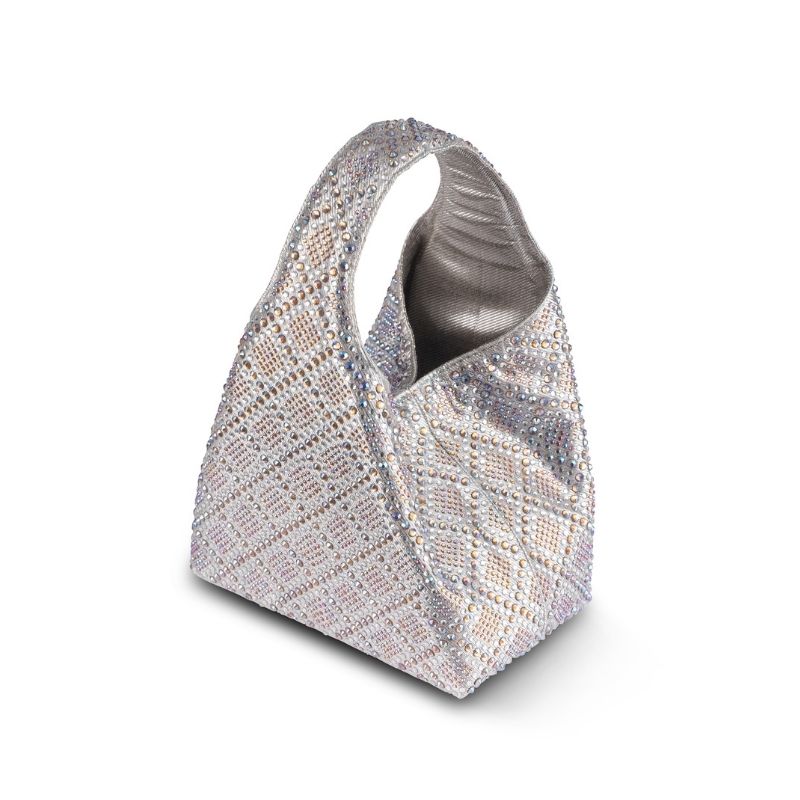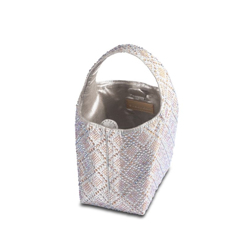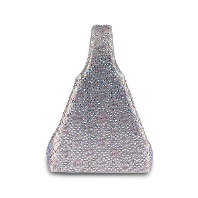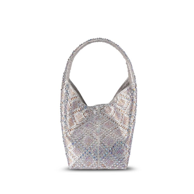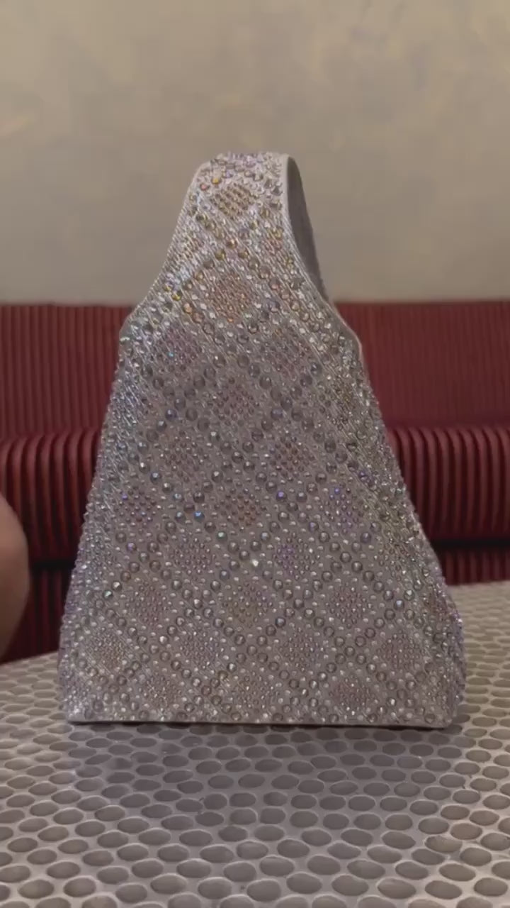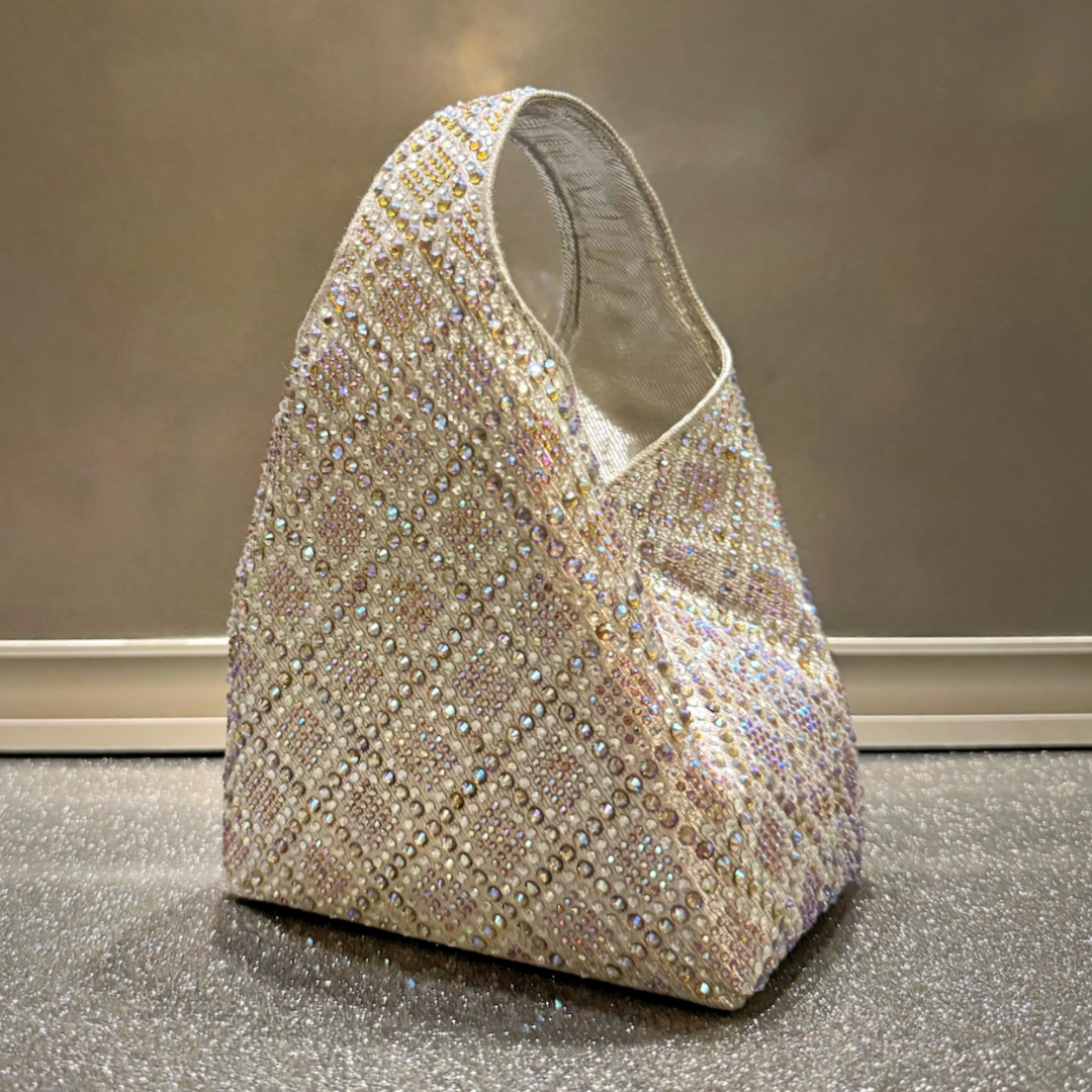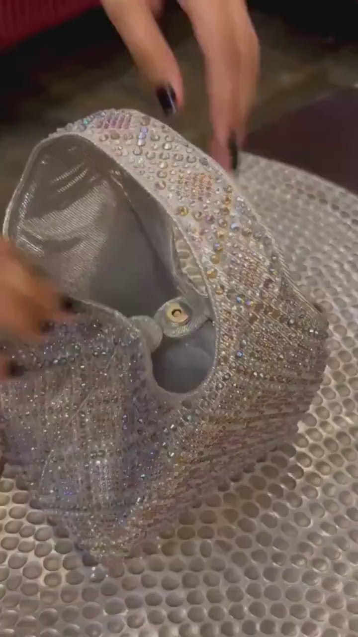 An iredescent silver party bag with gold hues. A perfect silver bag to match with your festive outfits. The entire bag is embellished with iredescent crystals to create a shimmer of silver and gold. The bag comes with a magnetic closure at the opening for keeping your items secure.