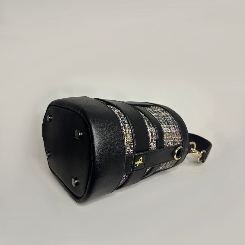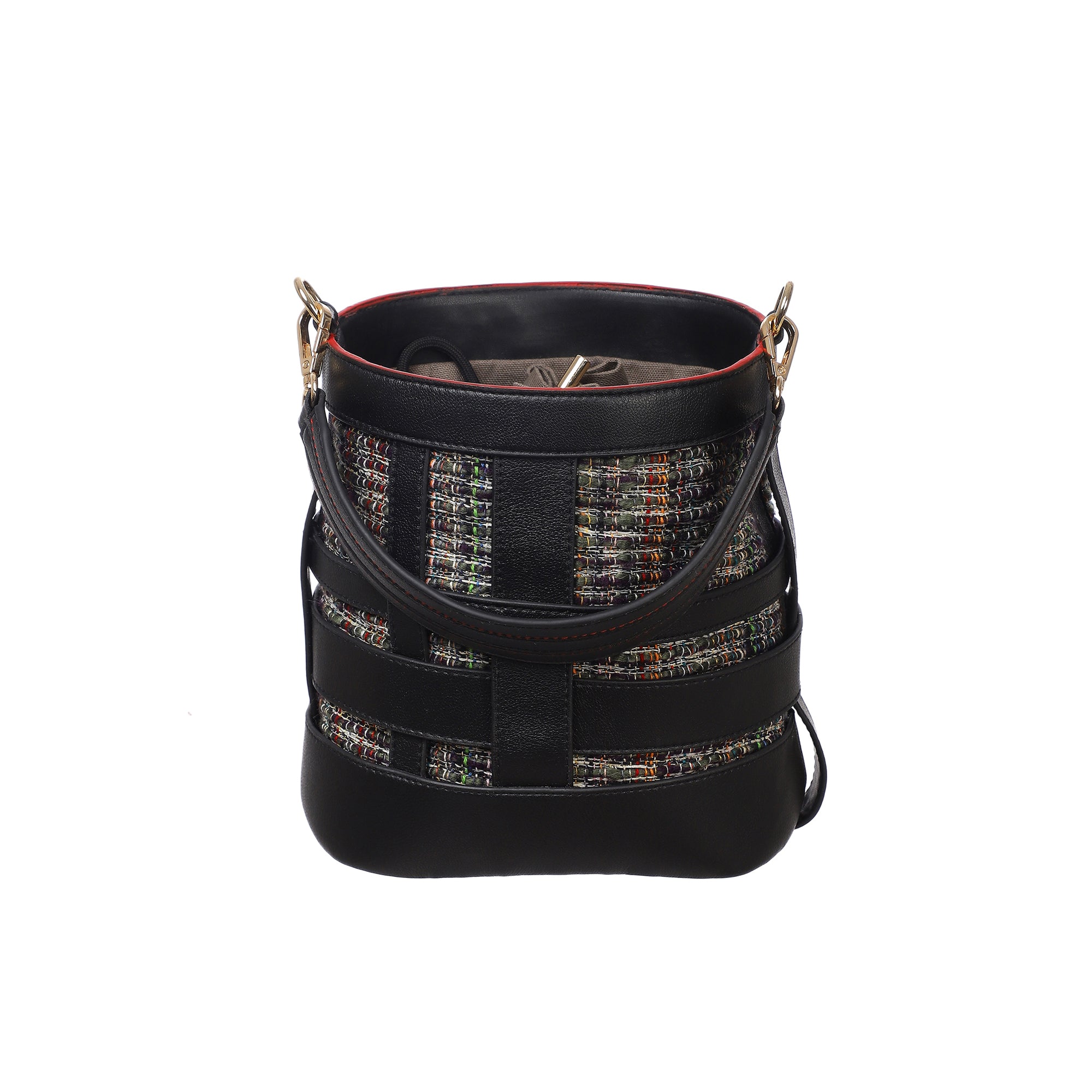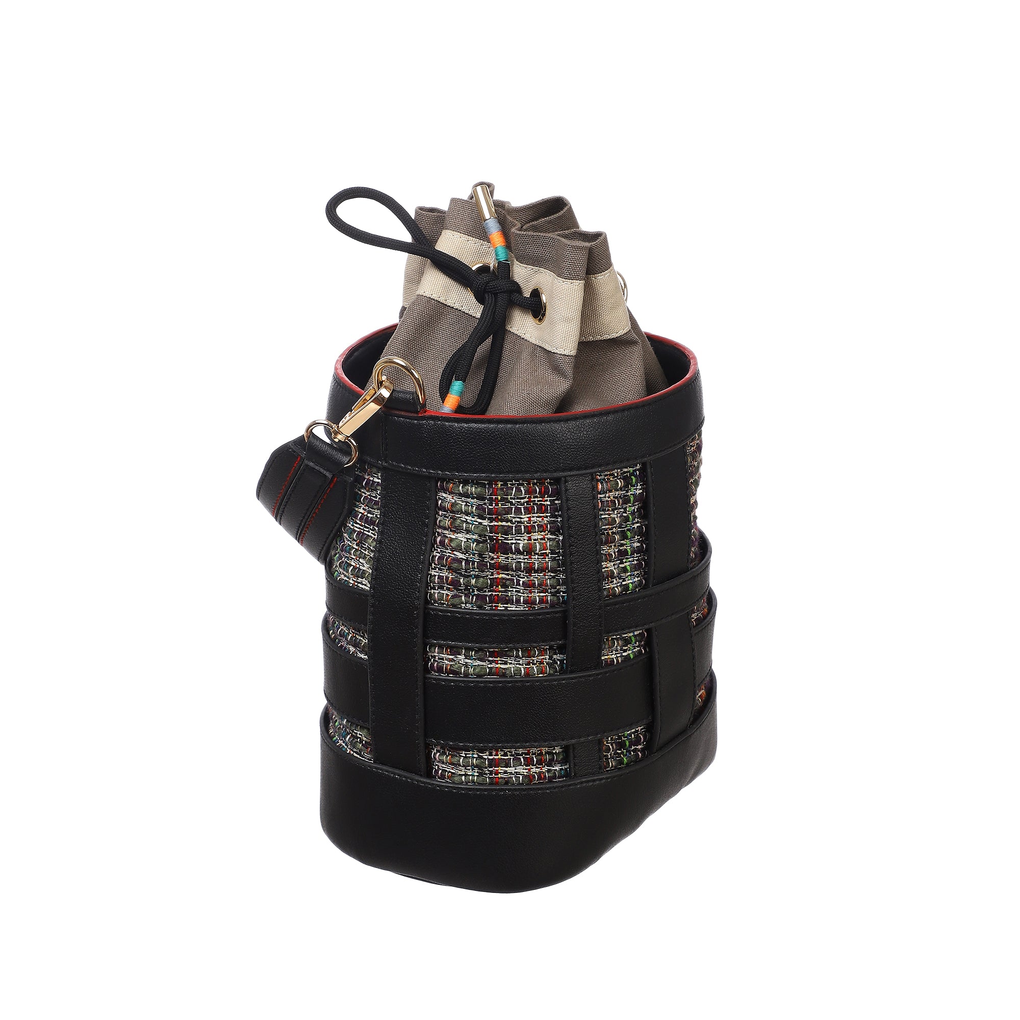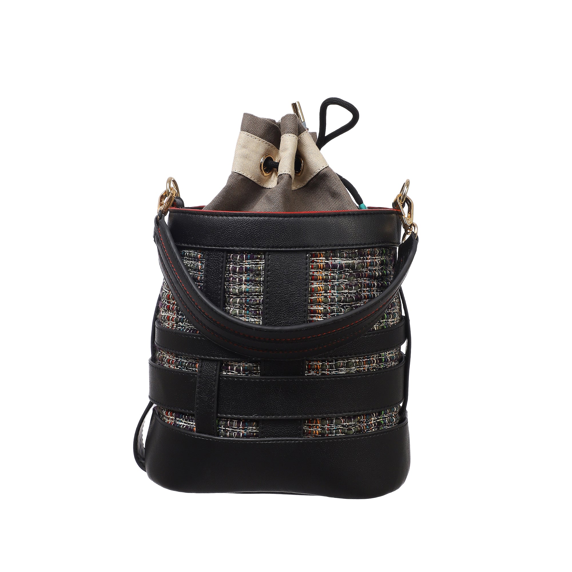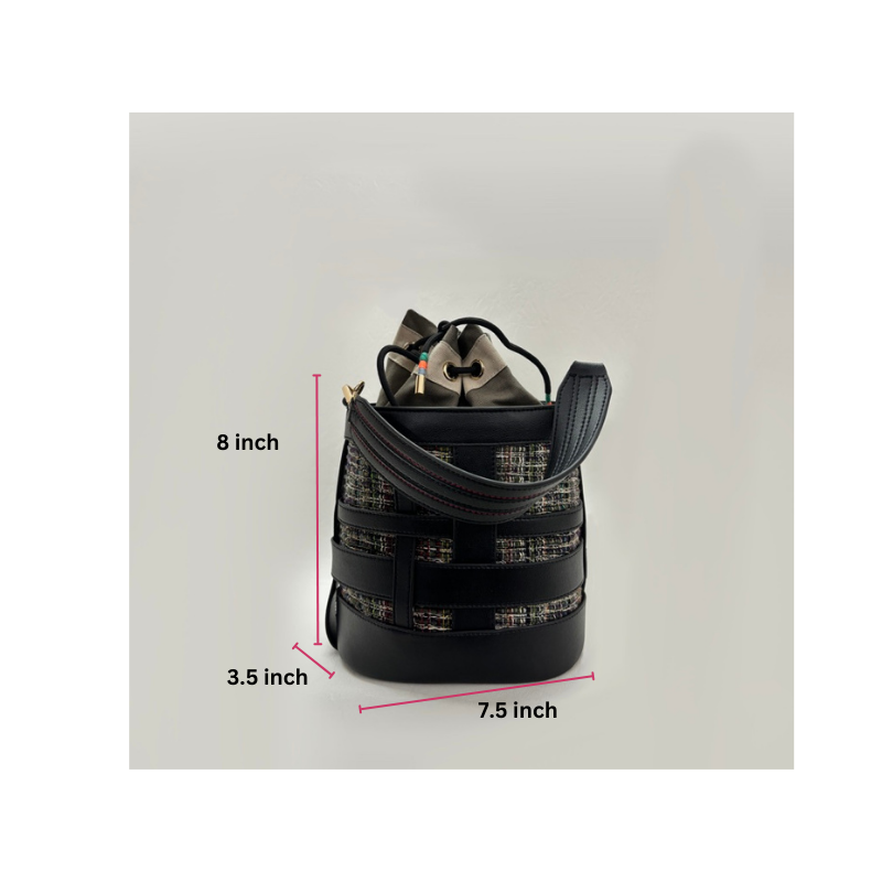 An oval shaped bucket bag for women in loosely interwoven vegan leather bands . The inside body in woven cotton loom fabric is stitched to the inner side of the bucket bag and shows through the black vegan leather bands. The top opening is secured with a cotton canvas fabric pouch. The bag is large enough to carry all your essentials, from your mobile to your travel make up pouch. The bag makes for a perfect accessory to be carried around throughout the day. It comes with a dust bag for you to keep it safe and protected when not in use.