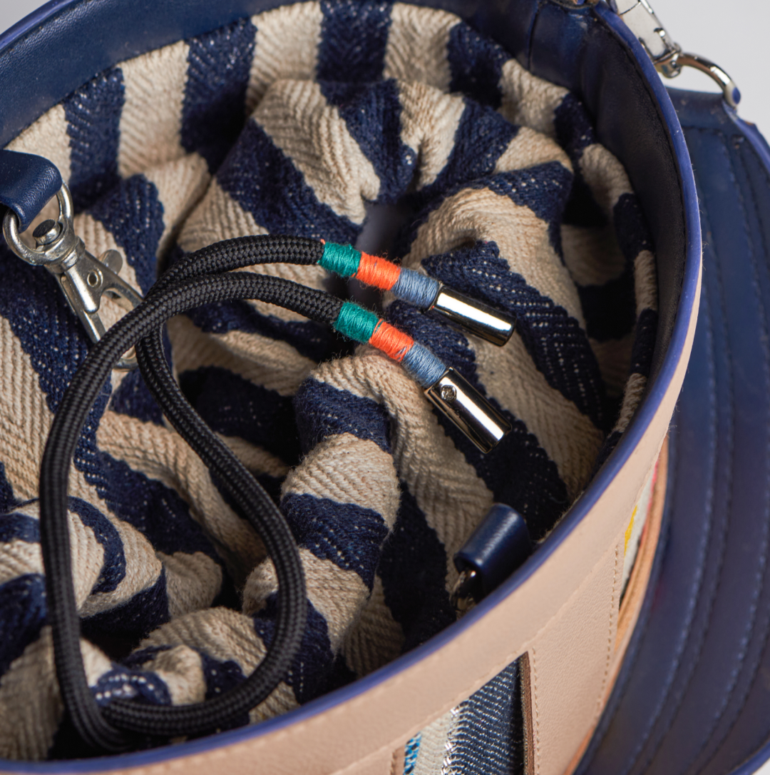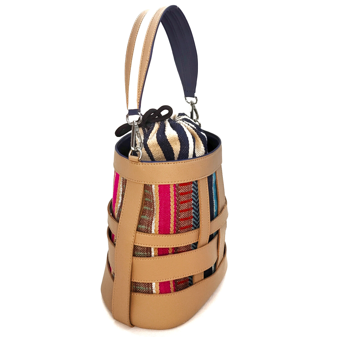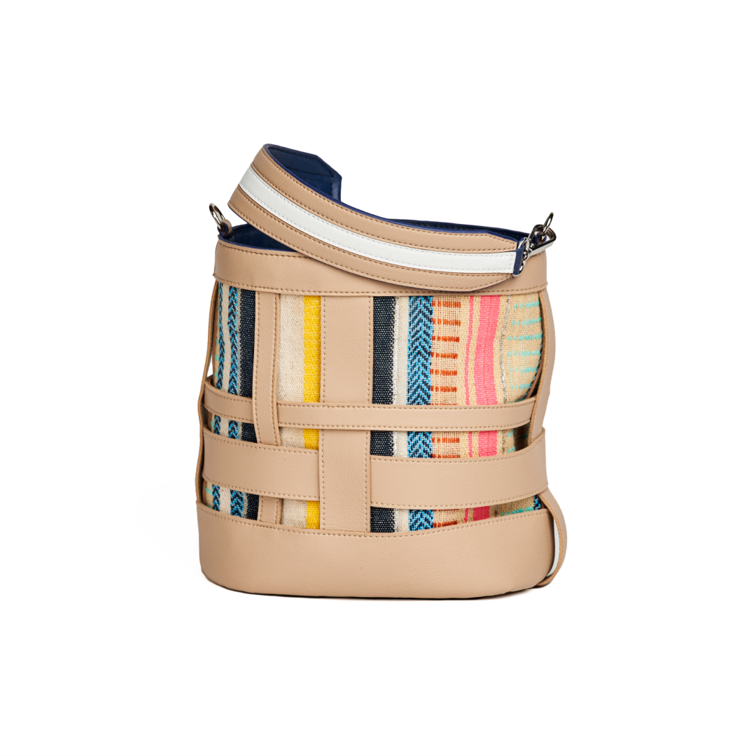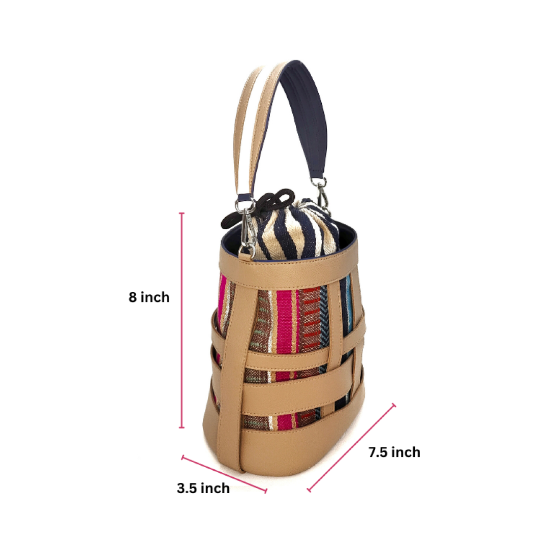 An oval shaped bucket bag in loosely interwoven vegan leather bands of different widths. The strips crisscross each other with irregular gaps in between. The inside body in multi colour cotton loom fabric stitched to the inner side of the bucket is visible from the spaces between the leather strips. The top opening is secured with a fabric pouch. The bag is large enough to carry all your essentials, from your mobile to your travel make up pouch. The boho look of the bag makes for a perfect accessory with your outfits. It comes with a dust bag for you to keep it safe and protected when not in use.