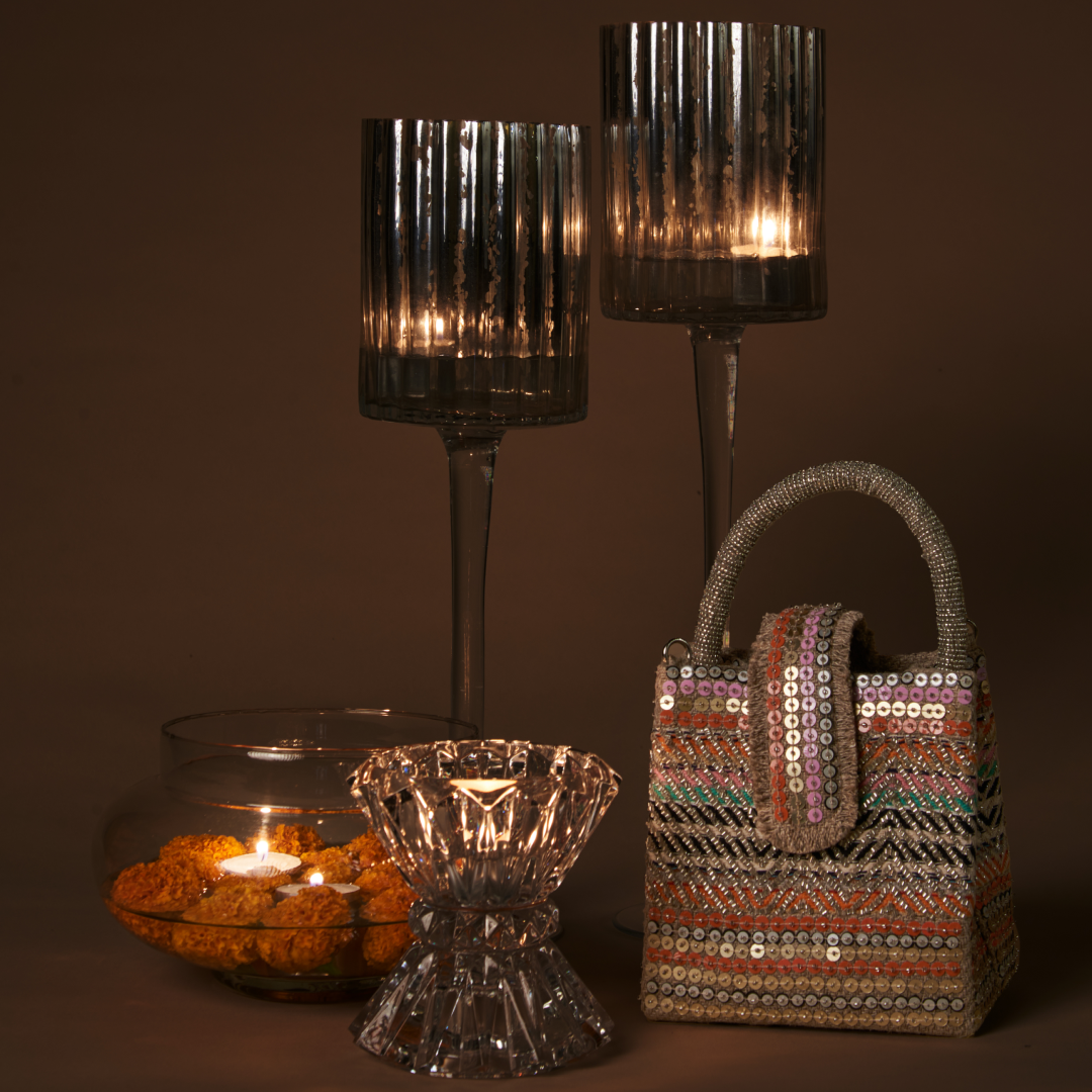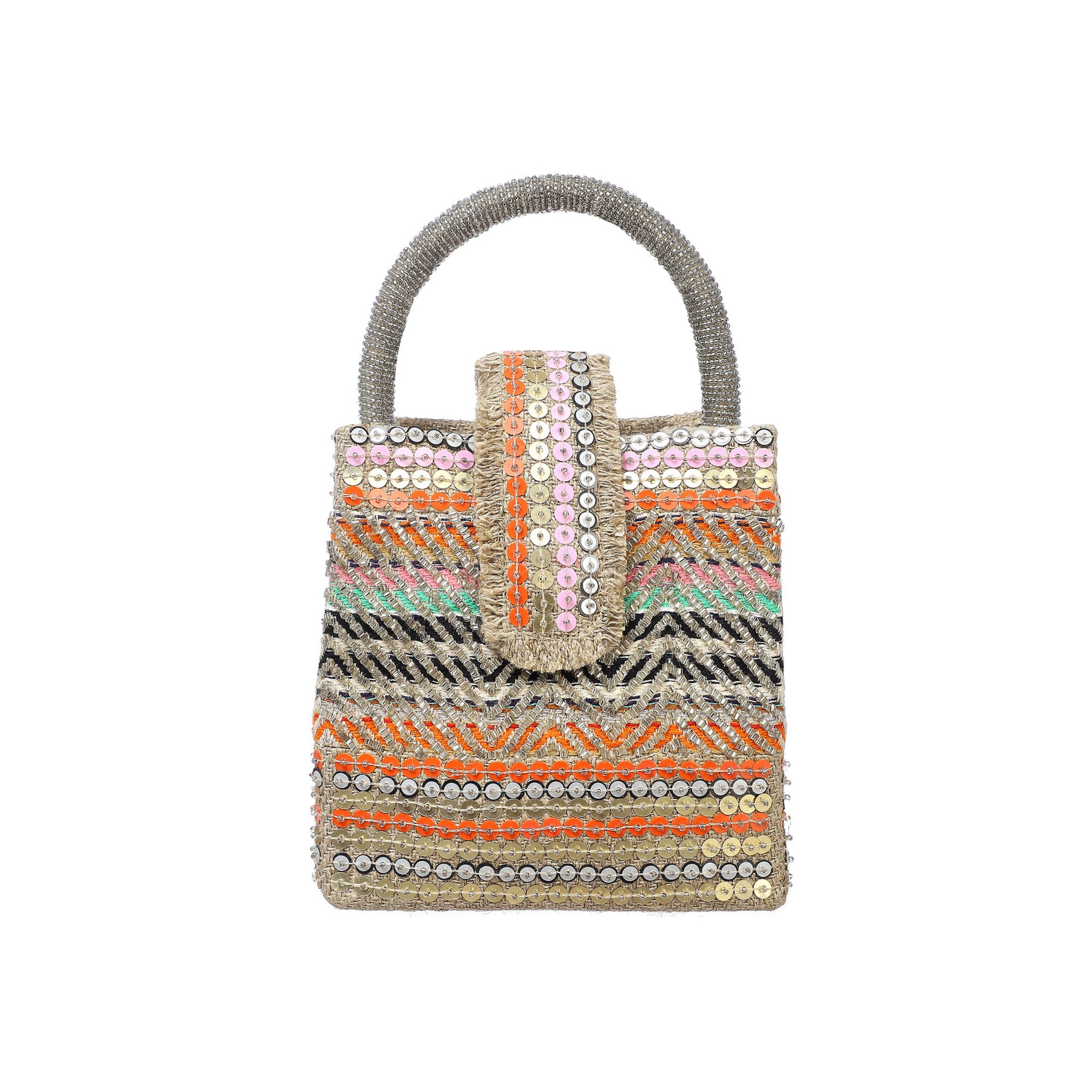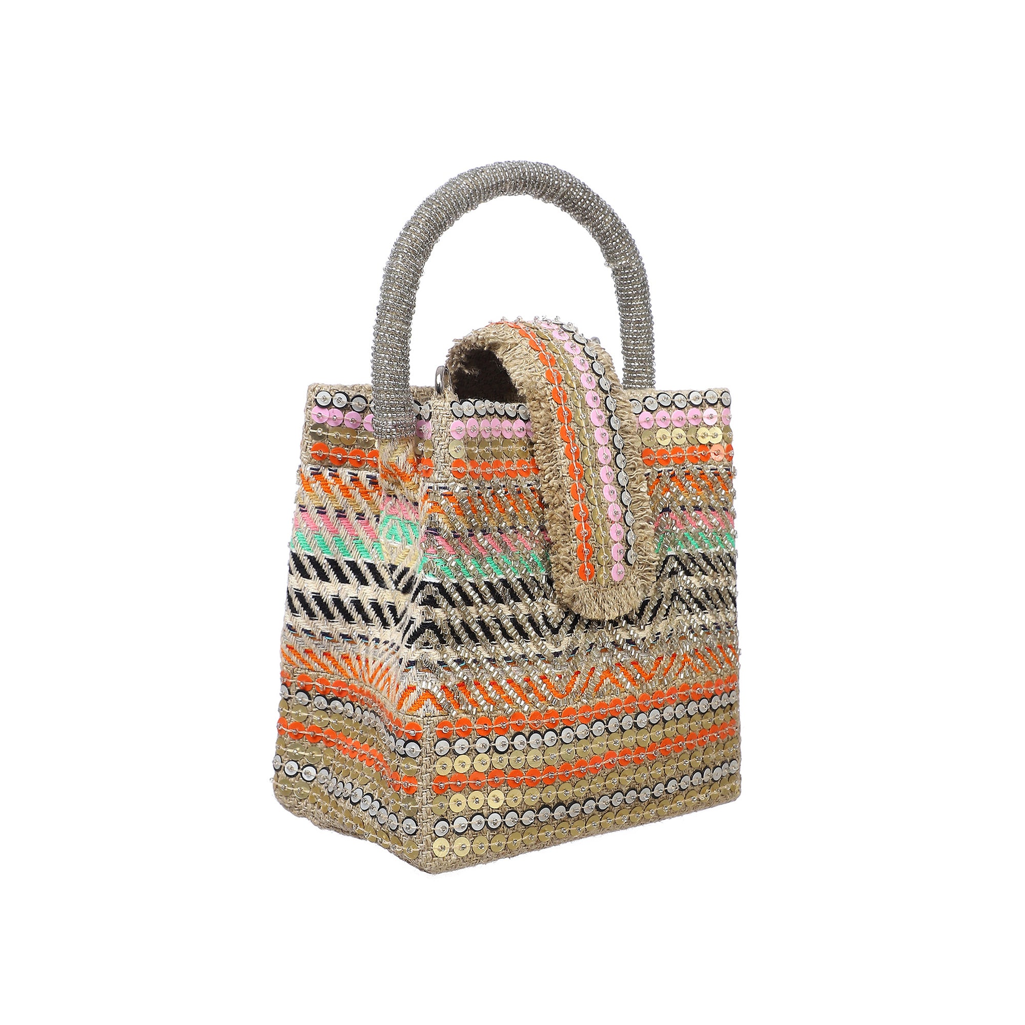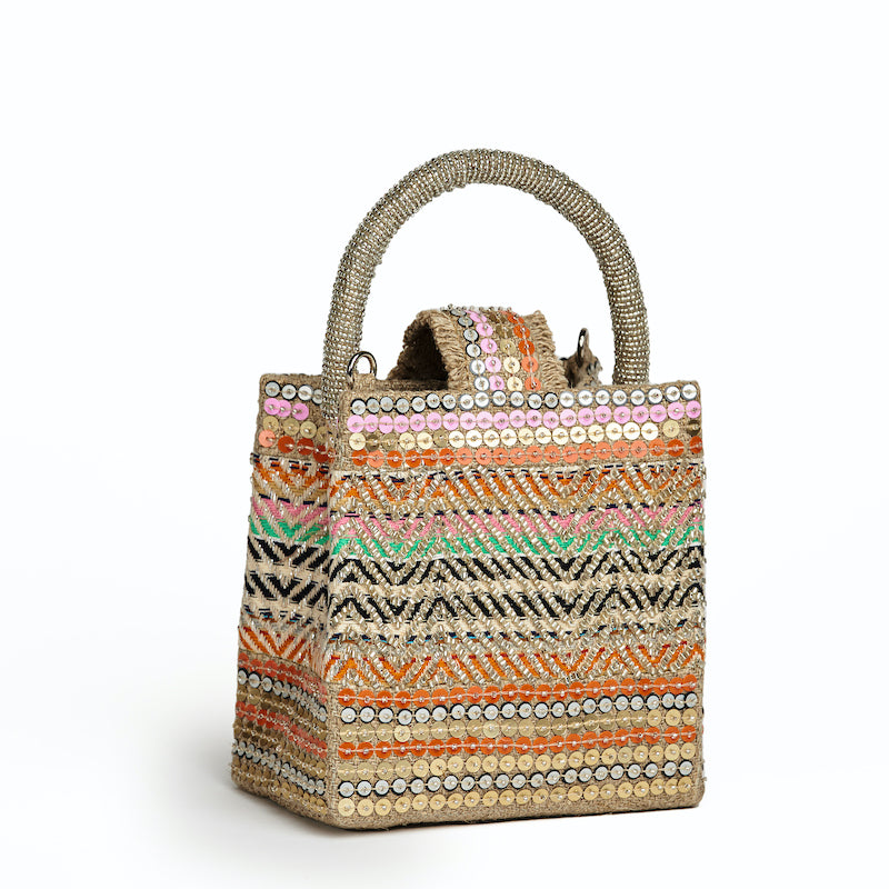 Mini Tote for your colourful evenings. Made of linen jute fabric with embellishment of sequins all over. The inside of the tote is lined with cotton lining. The tote comes with an embellished handle and magnetic closure flap. A detachable silver chain is added in the bag for carrying it as a sling. The bag gives a colourful vibrant look and can be carried for any kind of functions or parties and can be paired with sarees, suits, gowns, dresses. A perfect for all your festivities. The size is perfect to carry all your party essentials.