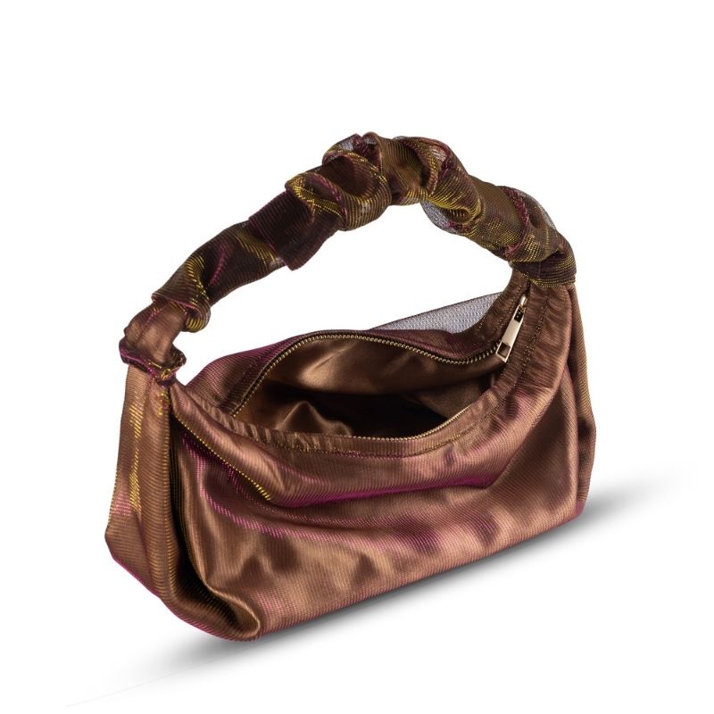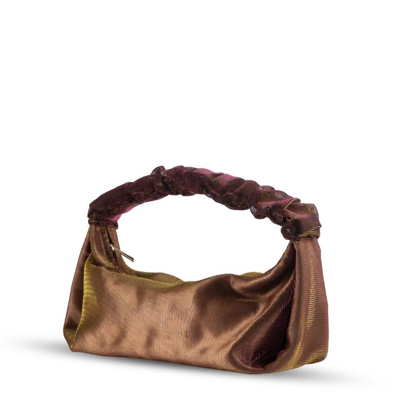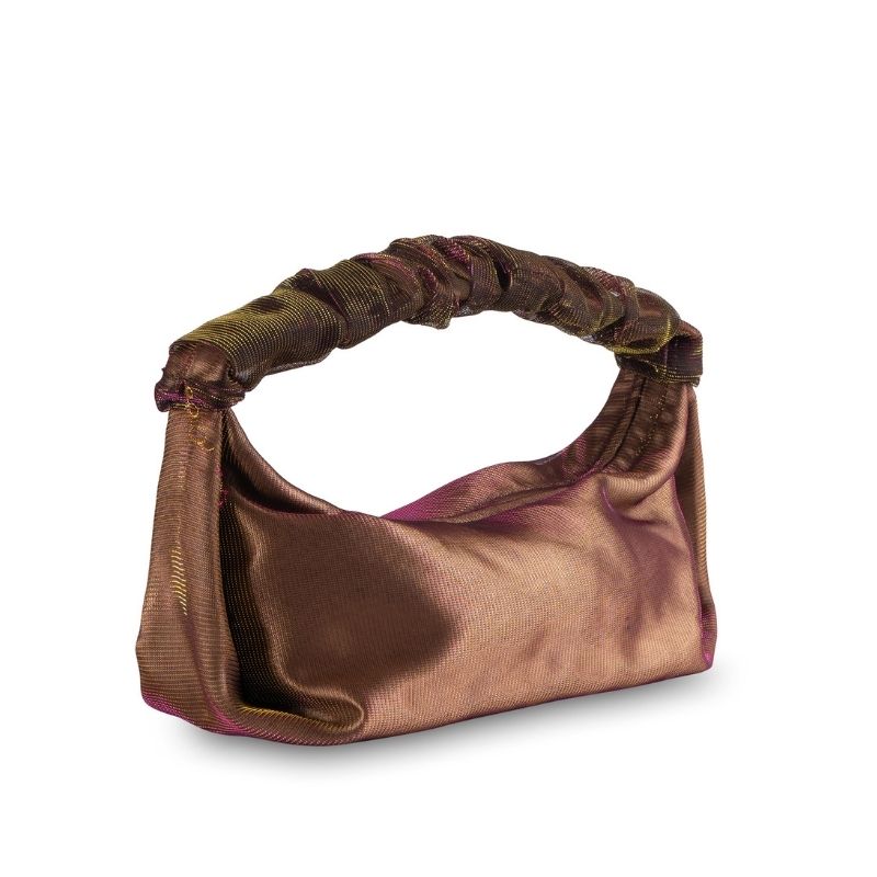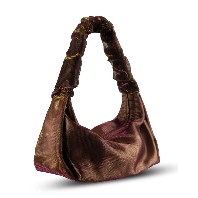 Handle detail: A ruffled handle in the shimmer sheer fabric with satin underlay is stitched on the two top ends of the bag. The handle is a perfect length for hand carry