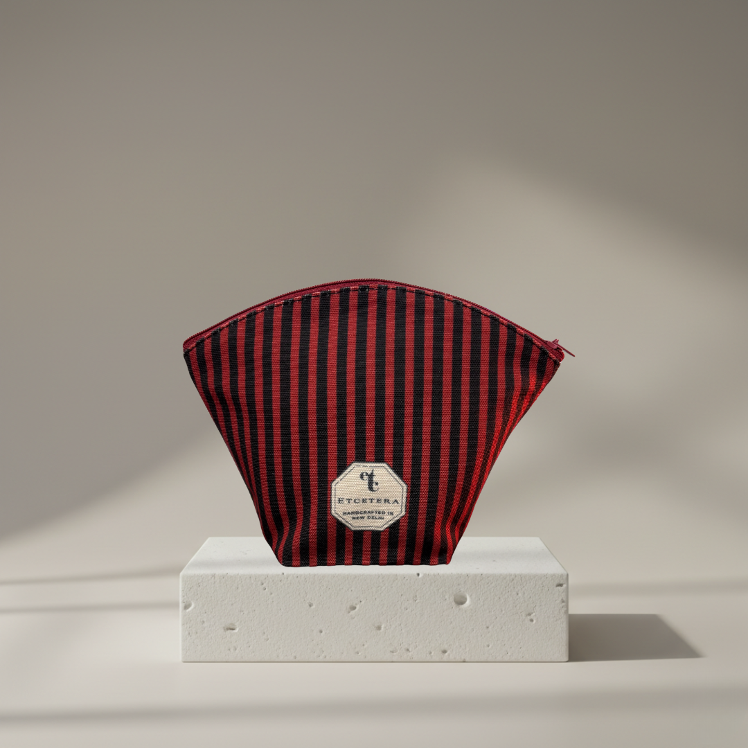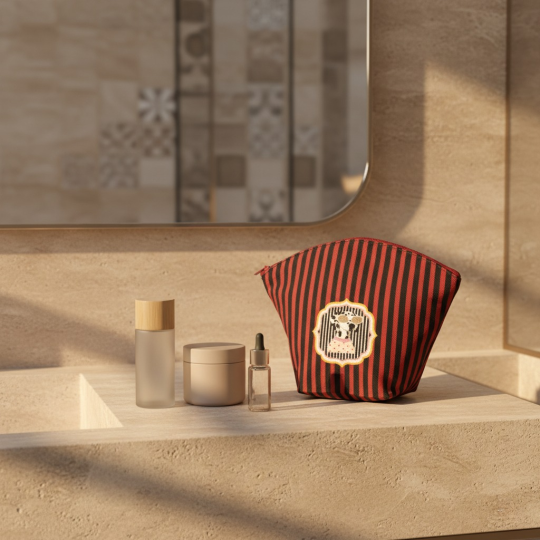 The Stripe Right Vanity Pouch – No Leash brings bold red-and-black stripes together with a confident dog motif that feels playful, graphic, and quietly luxe. Crafted from digitally printed canvas, this fan-shaped pouch opens wide and fits your daily beauty essentials, travel minis, cables, and everything you like to keep close, without digging around.