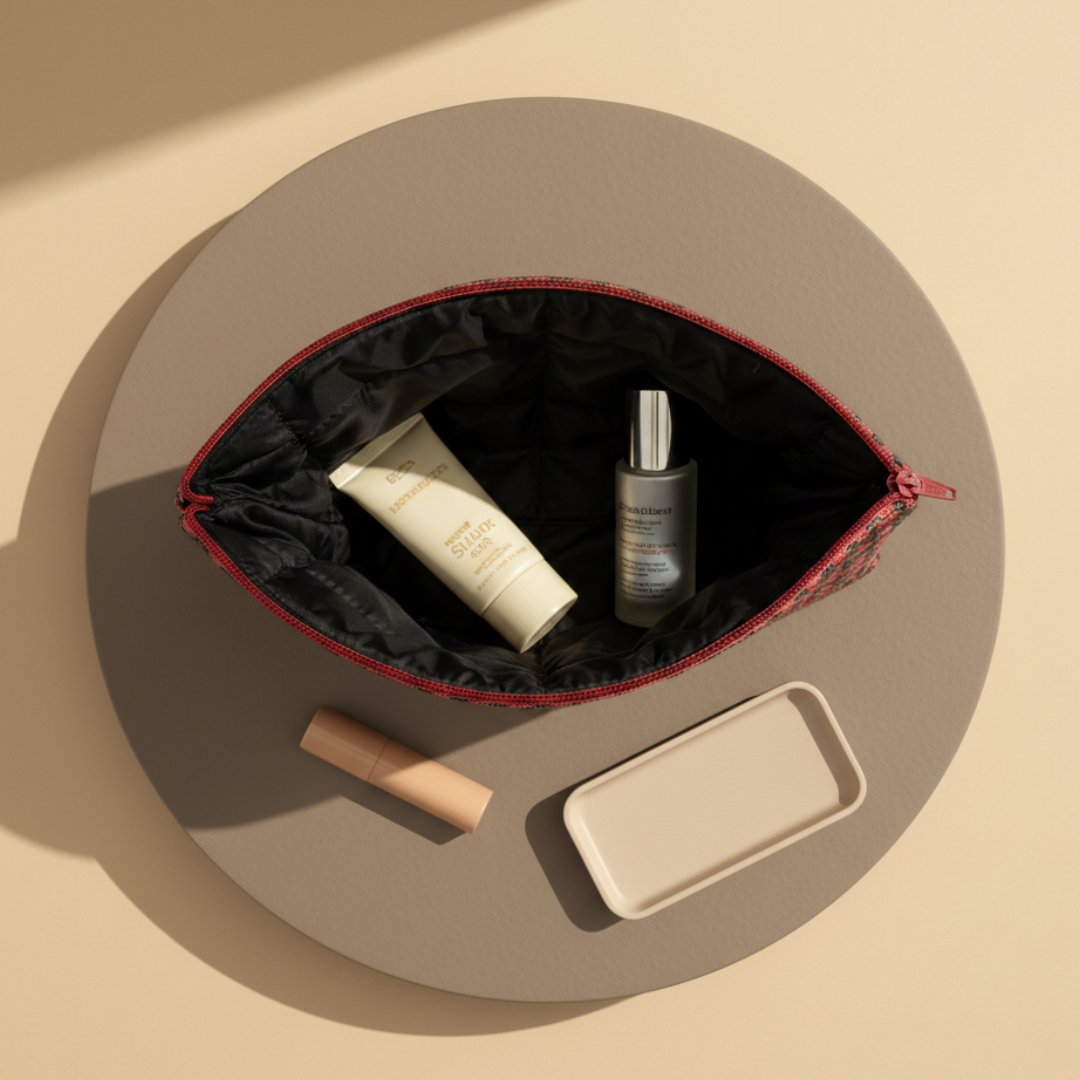 Designed to stand upright and hold its shape, it’s sturdy, roomy, and effortlessly put together. The kind of pouch that looks good on your dresser, in your tote, or mid-travel.