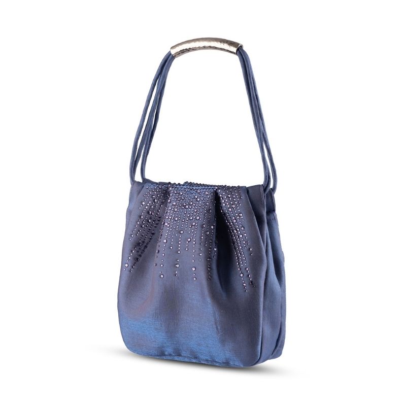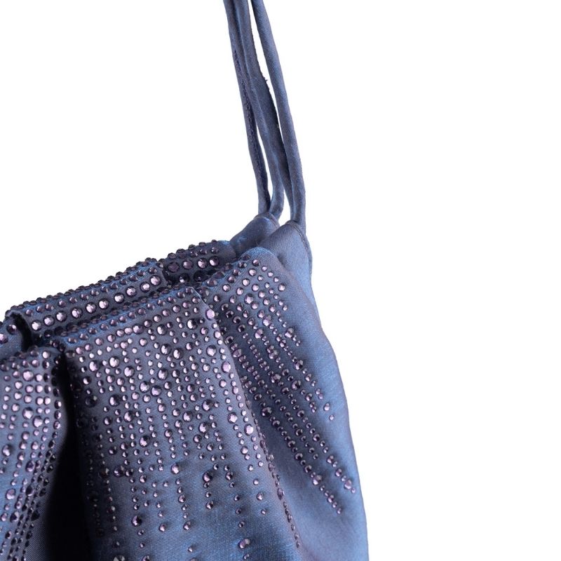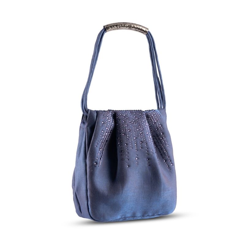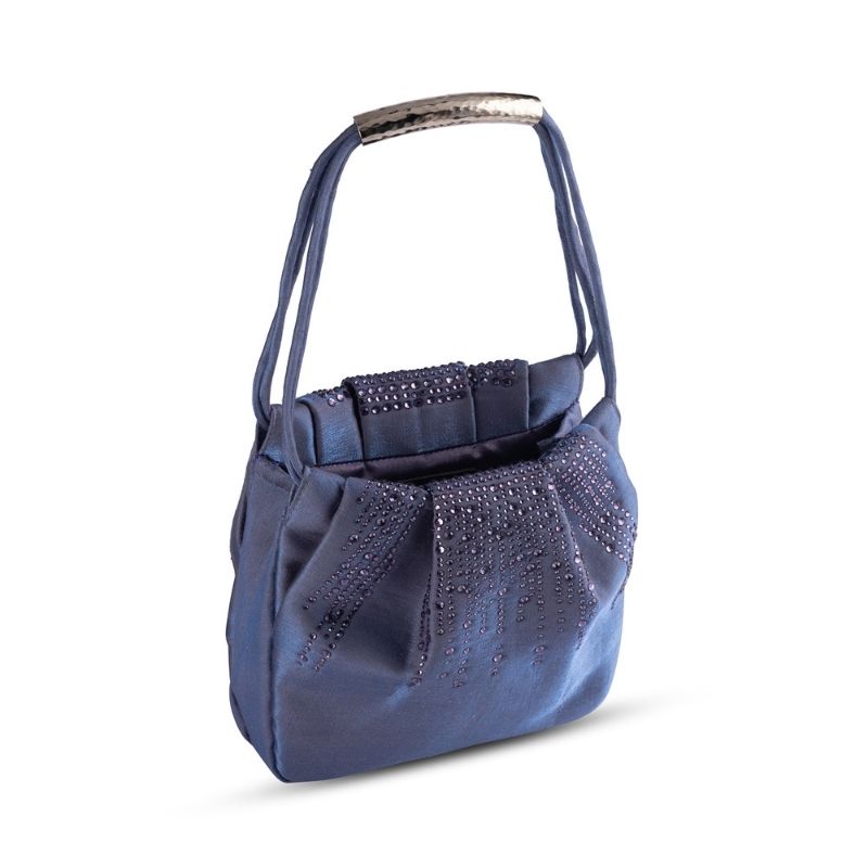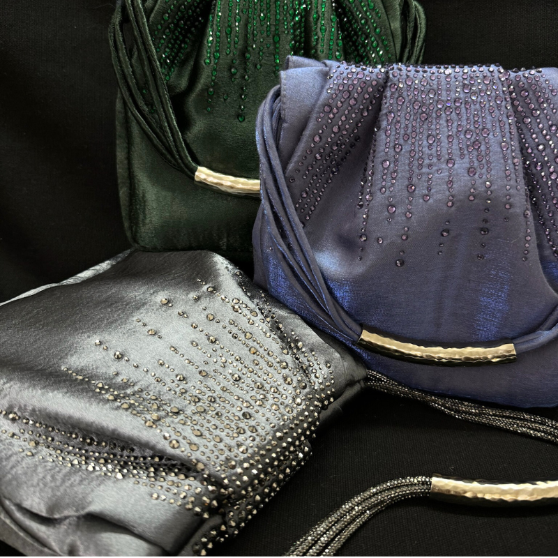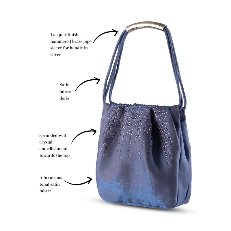 A luxurious satin fabric mini party bag for semi formal occassions. The bag is sprinkled with tonal crystal embellishments towards the top of the bag. The opening on top is held together with a magnetic closure. Its a small party bag perfect size for your party essentials and your mobile. The bag is available in three colour variants.