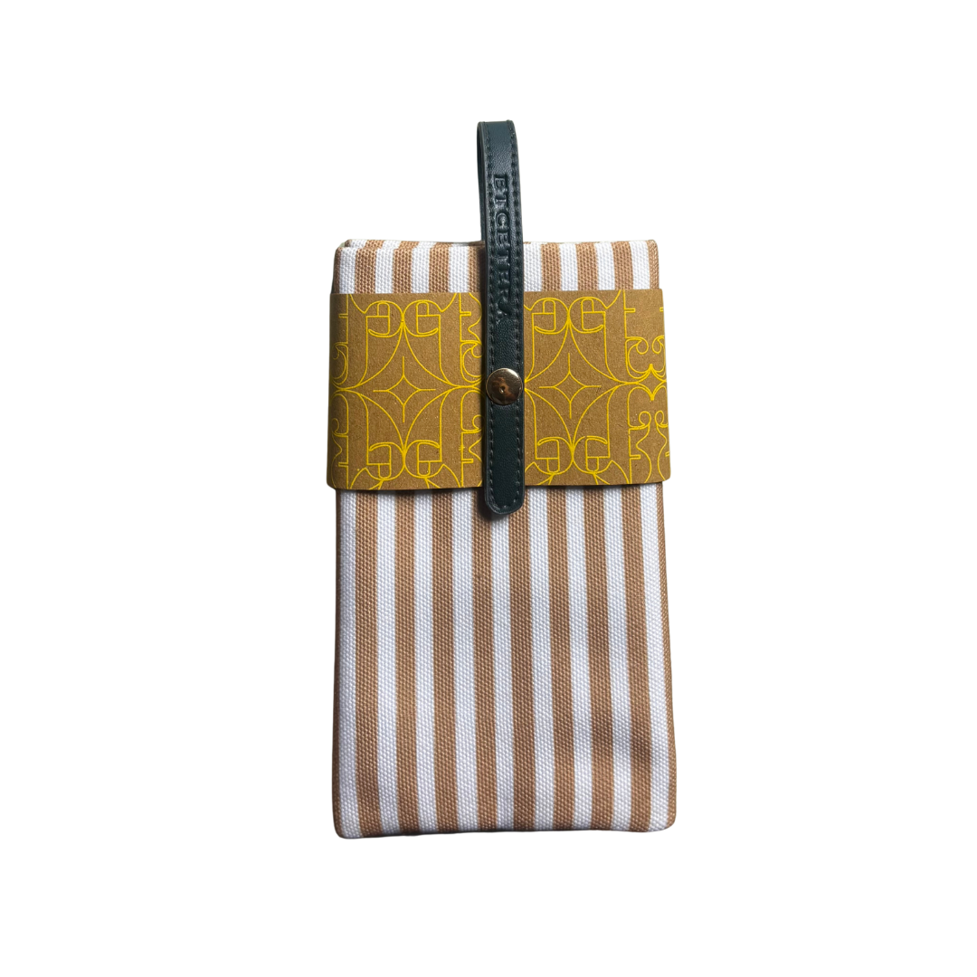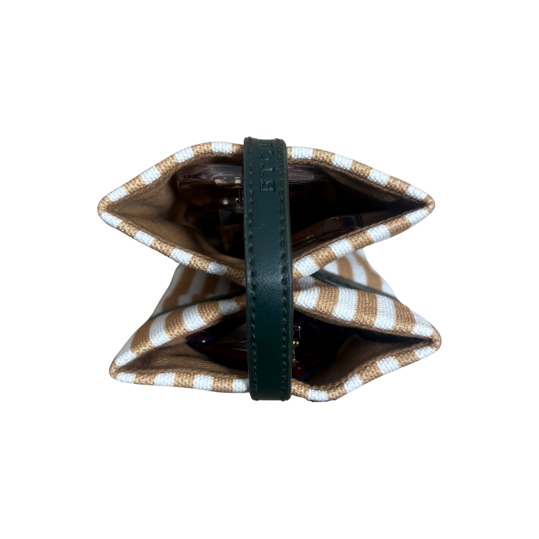 Say hello to the eyewear essential that simplifies your everyday, the Twin Carry Eyeglass Pouch. Designed with warm beige–cream stripes on canvas and a cushioned inner body. This one pairs beautifully with a deep forest-green vegan-leather strap and a polished gold button for a clean, modern finish.