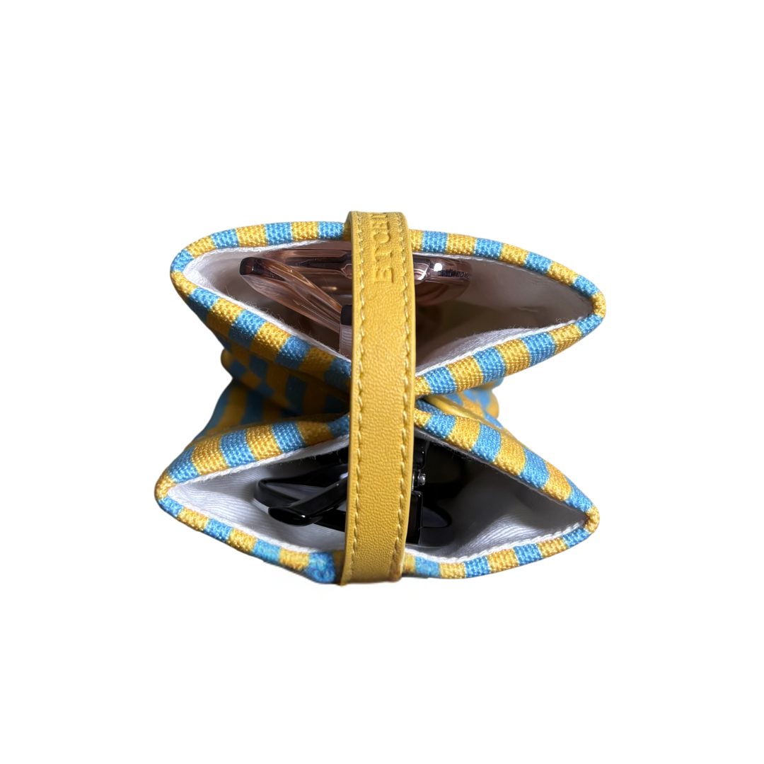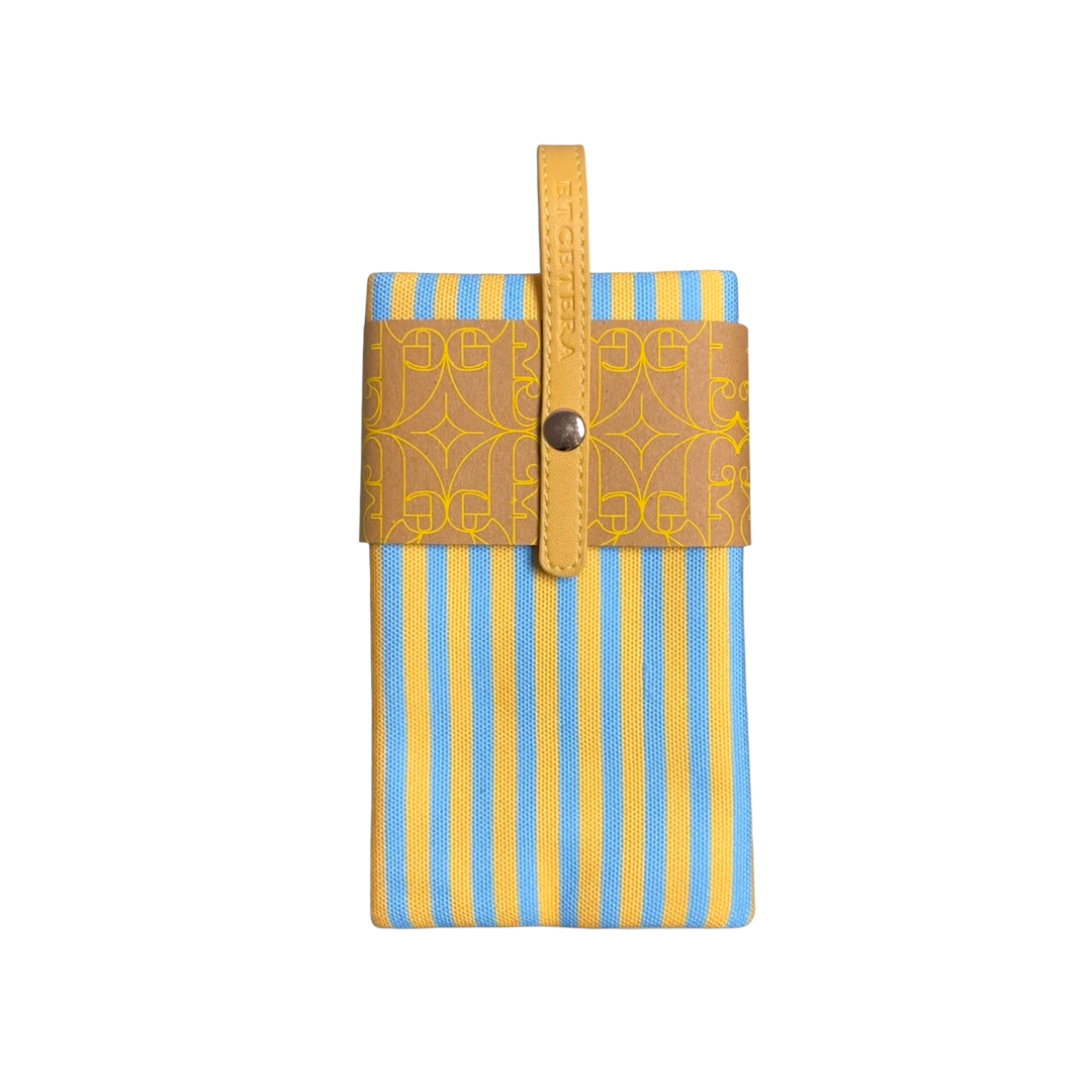 Meet your new out-and-about essential, Twin Carry Eyeglass Pouch, designed to keep both your favourites safe. Crafted in bold blue–yellow canvas stripes with a cushioned body, it features a smooth vegan-leather strap and a gold button closure. Two separate interiors mean no scratching, no juggling, no hard decisions. Just sunglasses and reading glasses living in harmony. Lightweight, bright, and easy to slip into any party bag, this pouch adds a cheerful pop of colour wherever it goes.